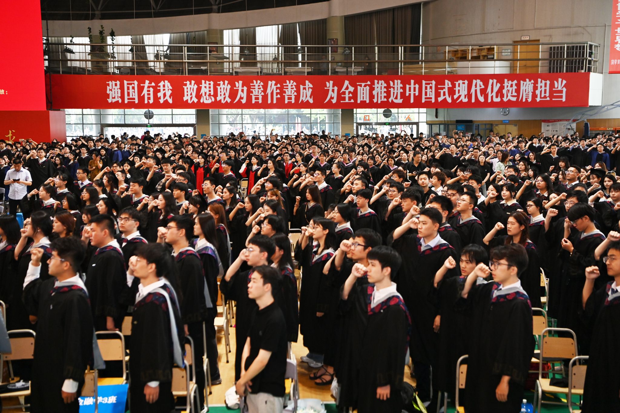 全場(chǎng)畢業(yè)生高舉右拳齊聲宣誓:將傳承西財(cái)精神、發(fā)揚(yáng)西財(cái)校訓(xùn),堅(jiān)定理想信念、錘煉過硬本領(lǐng)、肩負(fù)社會(huì)責(zé)任、擔(dān)當(dāng)時(shí)代使命,讓青春在祖國(guó)和人民最需要的地方綻放,為中華民族偉大復(fù)興和人類文明共同進(jìn)步貢獻(xiàn)力量。