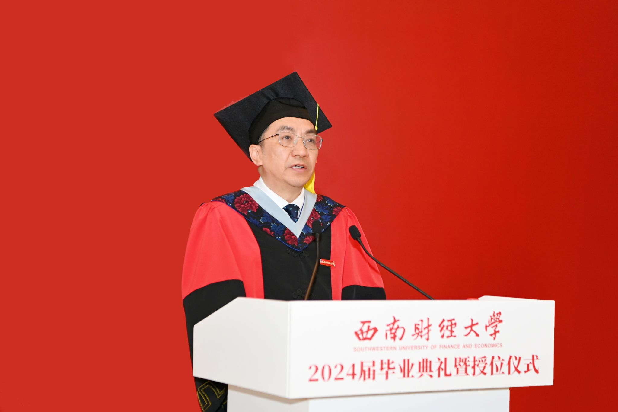 趙建軍主持典禮時(shí)指出,“經(jīng)世濟(jì)民、孜孜以求”的西財(cái)精神,既蘊(yùn)含著一所大學(xué)“教育報(bào)國(guó)”的崇高使命,又飽含著全體師生“愛國(guó)奉獻(xiàn)”的信念追求,還彰顯著財(cái)經(jīng)學(xué)科的底蘊(yùn)特色,是每一名西財(cái)人奮進(jìn)拼搏的思想源泉和不竭動(dòng)力。他深情勉勵(lì)畢業(yè)生在今后的人生之路上傳承好西財(cái)精神,做行動(dòng)派、當(dāng)實(shí)干家,在強(qiáng)國(guó)建設(shè)、民族復(fù)興偉業(yè)中貢獻(xiàn)西財(cái)青春力量。趙建軍寄語西財(cái)青年,要樹立“經(jīng)世報(bào)國(guó)”的遠(yuǎn)大志向,以理想為帆、奮斗為槳,堅(jiān)定不移聽黨話、跟黨走,把準(zhǔn)人生方向,積極投身強(qiáng)國(guó)建設(shè)、民族復(fù)興偉業(yè),在“強(qiáng)國(guó)有我”的實(shí)踐中不斷提高本領(lǐng)能力,自覺在以中國(guó)式現(xiàn)代化全面推進(jìn)中華民族偉大復(fù)興的嶄新征程中挺膺擔(dān)當(dāng)。要厚植“濟(jì)民安邦”的為民情懷,涵養(yǎng)“我將無我”的境界、扛牢“不負(fù)人民”的責(zé)任,堅(jiān)持人民至上,在工作崗位上深入基層、深入群眾,既向人民群眾學(xué)習(xí),更解決他們的急難愁盼問題,自覺做到民之所憂,我必念之;民之所盼,我必行之。要錘煉“孜孜以求”的堅(jiān)韌品格,以奔騰不息的動(dòng)力、上下求索的毅力,干一行、愛一行、鉆一行,勇于做先鋒、當(dāng)闖將,在急難險(xiǎn)重中強(qiáng)壯筋骨,在摸爬滾打中增長(zhǎng)才干,迎難而上、艱苦奮斗、堅(jiān)韌不拔,一步一個(gè)腳印,在新時(shí)代新征程上留下無悔的青春足跡。