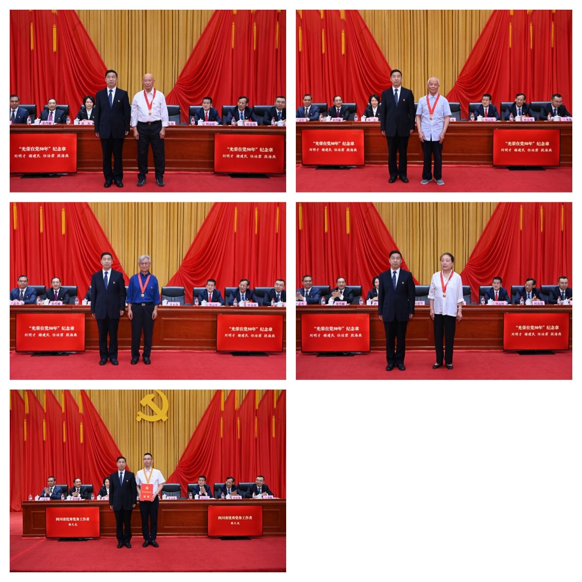 趙建軍為劉明才、謝建民、任治君、段海燕四位老黨員頒發“光榮在黨50年”紀念章,為四川省優秀黨務工作者韓文龍頒發證書。