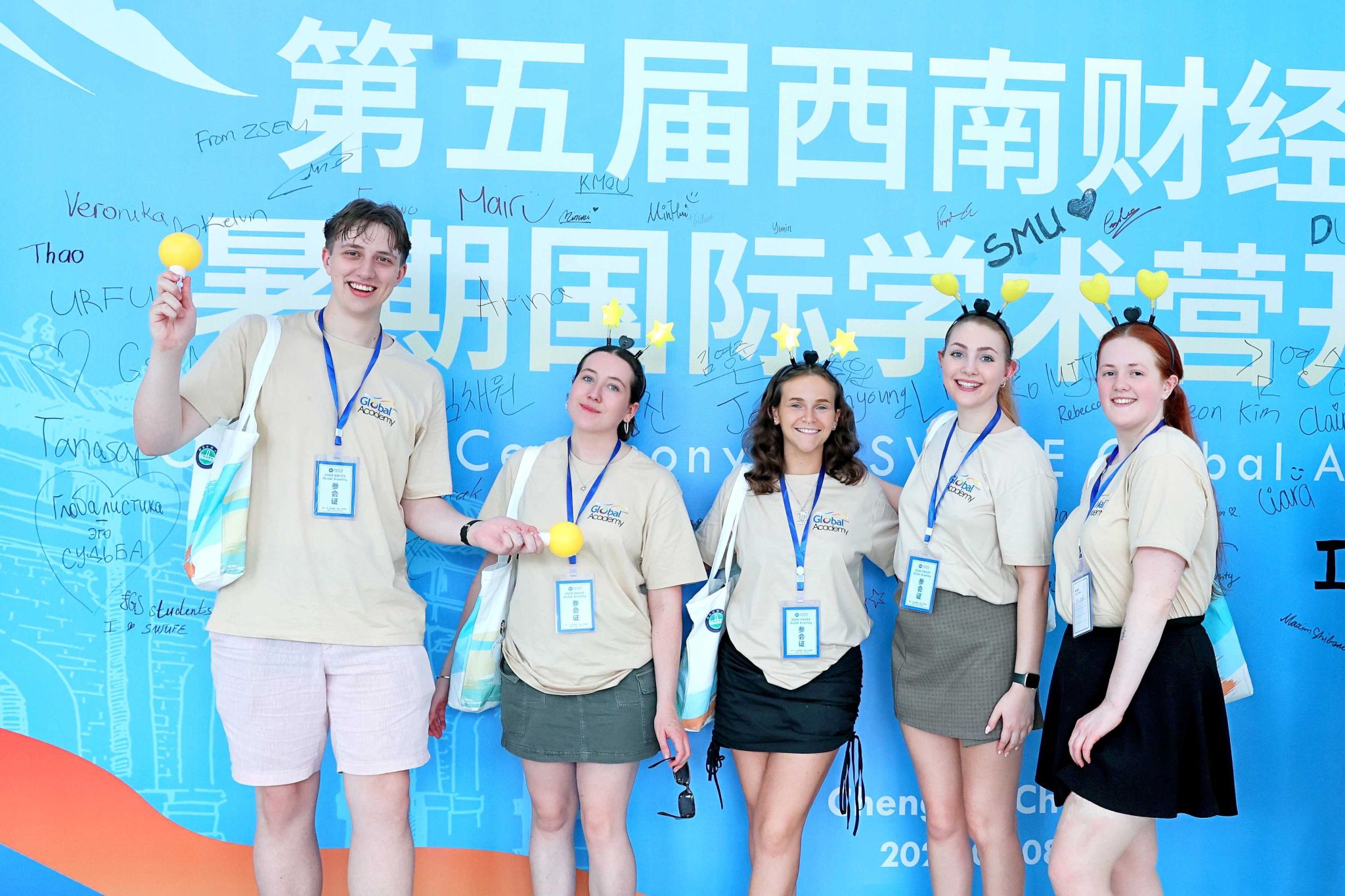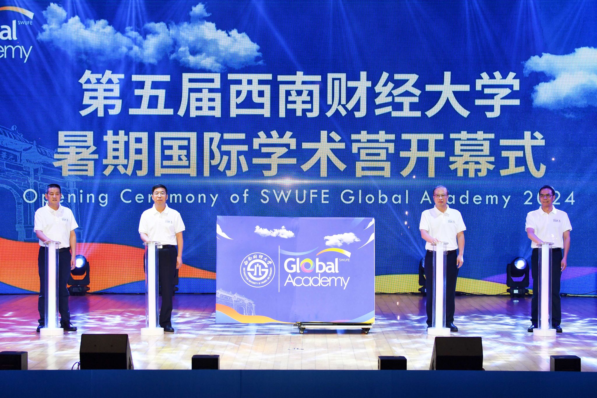 7月8日,西南財經大學第五屆暑期國際學術營(SWUFE Global Academy)在柳林校區學生活動中心盛大開幕。來自44個國家和地區的43所高校279位國際師生與西財師生共同參加開幕式。黨委書記趙建軍,黨委副書記、校長李永強,黨委副書記明海峰,黨委常委、副校長李志生共同為第五屆暑期國際學術營揭幕,學校有關單位負責人出席開幕儀式。