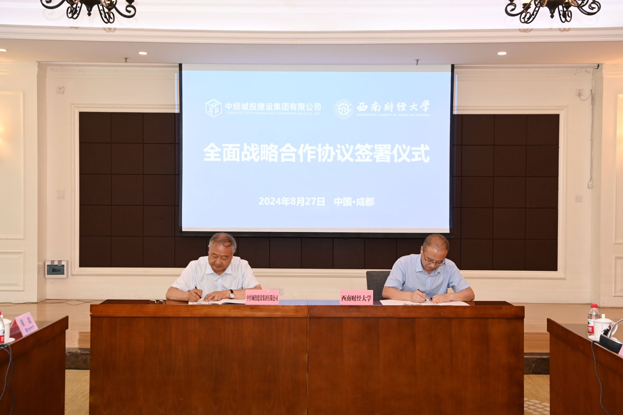 8月27日,學校與中經城投建設集團有限公司全面戰略合作協議簽署儀式在光華校區舉行。學校黨委書記趙建軍,黨委副書記、校長李永強,黨委常委、副校長桂富強;中經城投建設集團有限公司董事長婁德蘭、總裁助理李超,中經城投建設集團四川有限公司董事長陳川、總經理周繼武出席儀式。