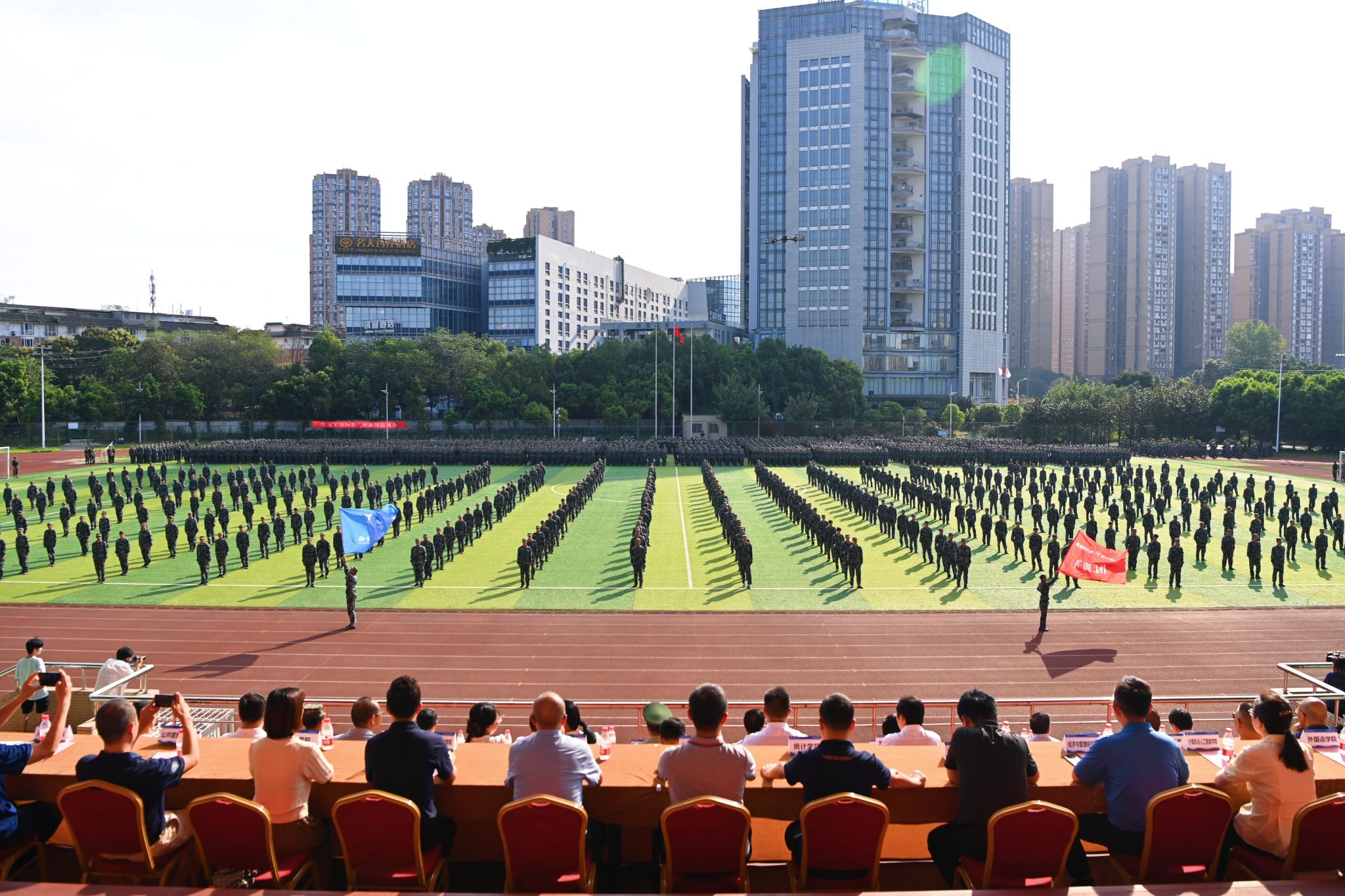 9月22日,學校2024級本科學生軍訓總結表彰大會在柳林校區(qū)晨曦運動場舉行。學校黨委書記趙建軍,黨委副書記謝紅、明海峰,黨委常委、副校長史代敏、李志生、王擎,武警成都支隊領導、學校軍訓工作領導小組成員單位負責人及各本科教學單位相關負責人參加大會。
