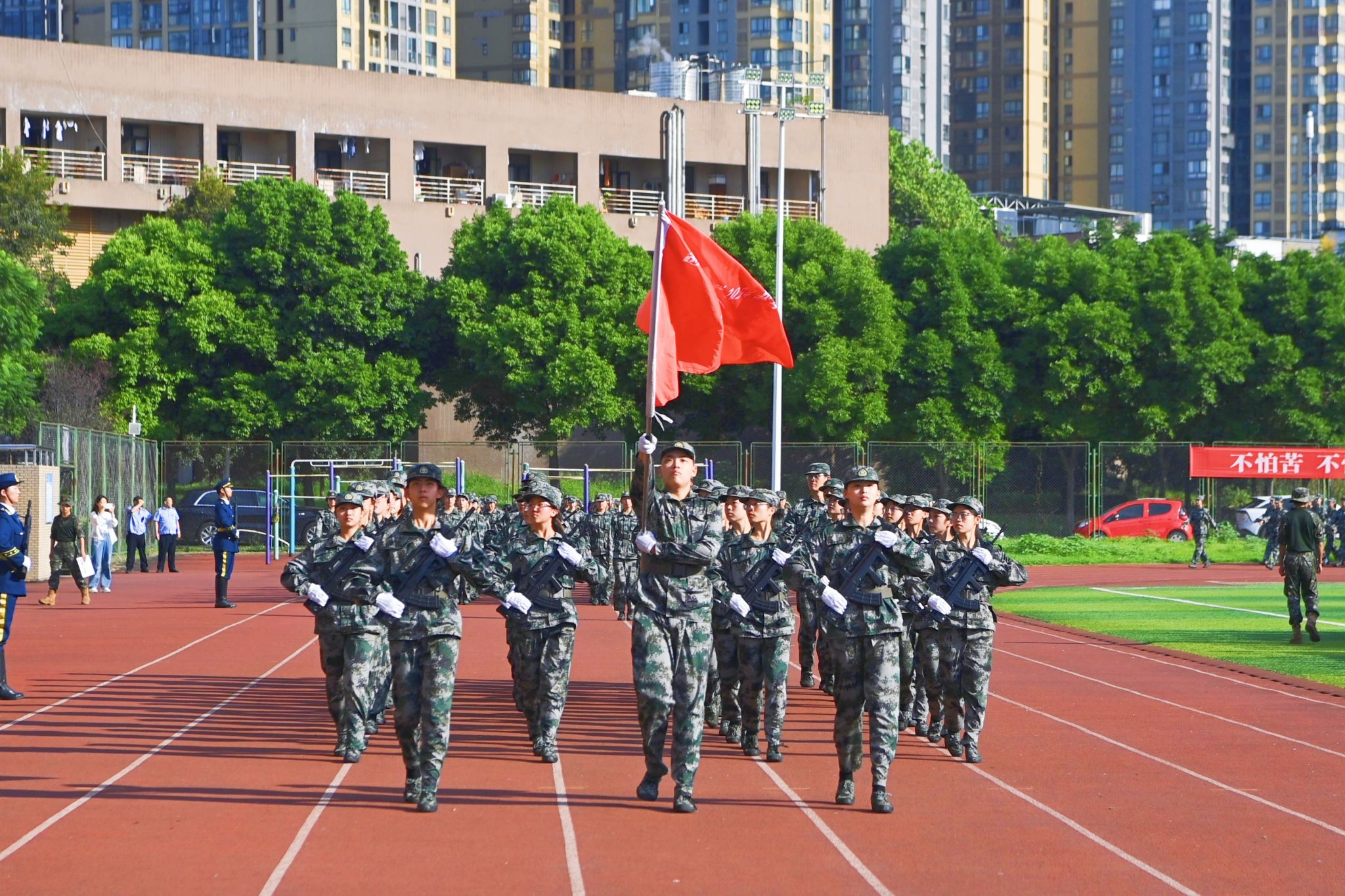 明海峰作軍訓總結講話。他首先代表學校軍訓工作領導小組向圓滿完成軍訓的同學們表示熱烈祝賀,向承擔本次軍訓任務的武警成都支隊教官、帶隊老師和工作人員表示衷心感謝。他指出,軍訓,不僅是一場對體力的極大挑戰(zhàn),更是一次對意志力的深刻淬煉。大家堅定信念“踢好正步”,遵守規(guī)矩“走好齊步”,提升能力“邁好闊步”,通過訓練進一步強健了體魄、磨礪了意志,增強了團隊協(xié)作意識,激發(fā)了崇軍尚武熱情,展現(xiàn)出西財學子良好精神風貌,順利完成大學第一堂“思政大課”。希望同學們增強自律自信、增強定力韌性、滿懷豪情激情,始終保持軍訓中養(yǎng)成的優(yōu)良作風,持續(xù)磨礪軍訓中錘煉的意志品質(zhì),不斷厚植軍訓中涵養(yǎng)的家國情懷,永遠保持昂揚向上的青春激情、理性平和的陽光心態(tài)和堅韌不拔的意志品質(zhì),踔厲奮發(fā)、勇毅前行,努力成為讓黨放心、愛國奉獻、擔當民族復興重任的時代新人。