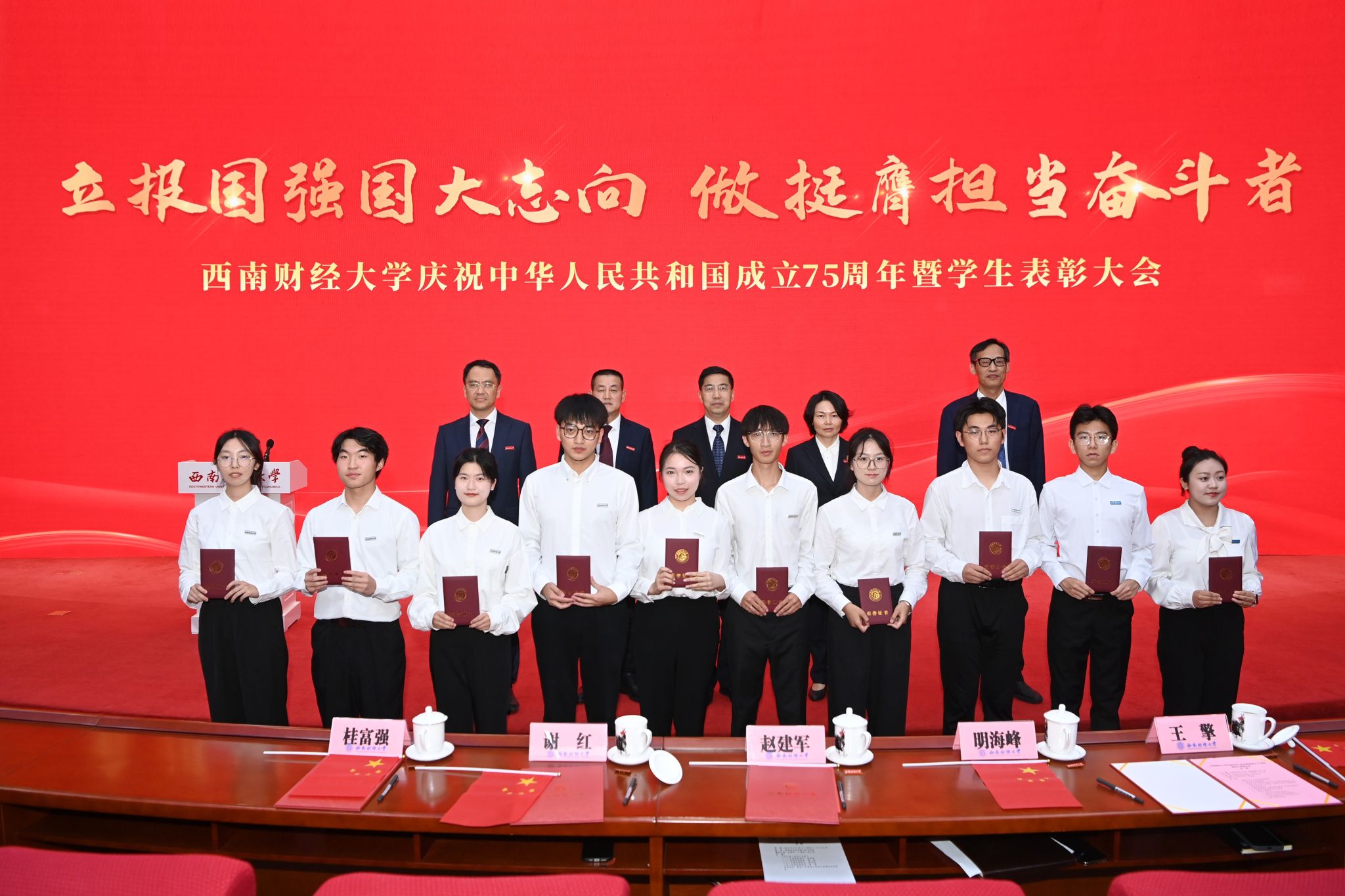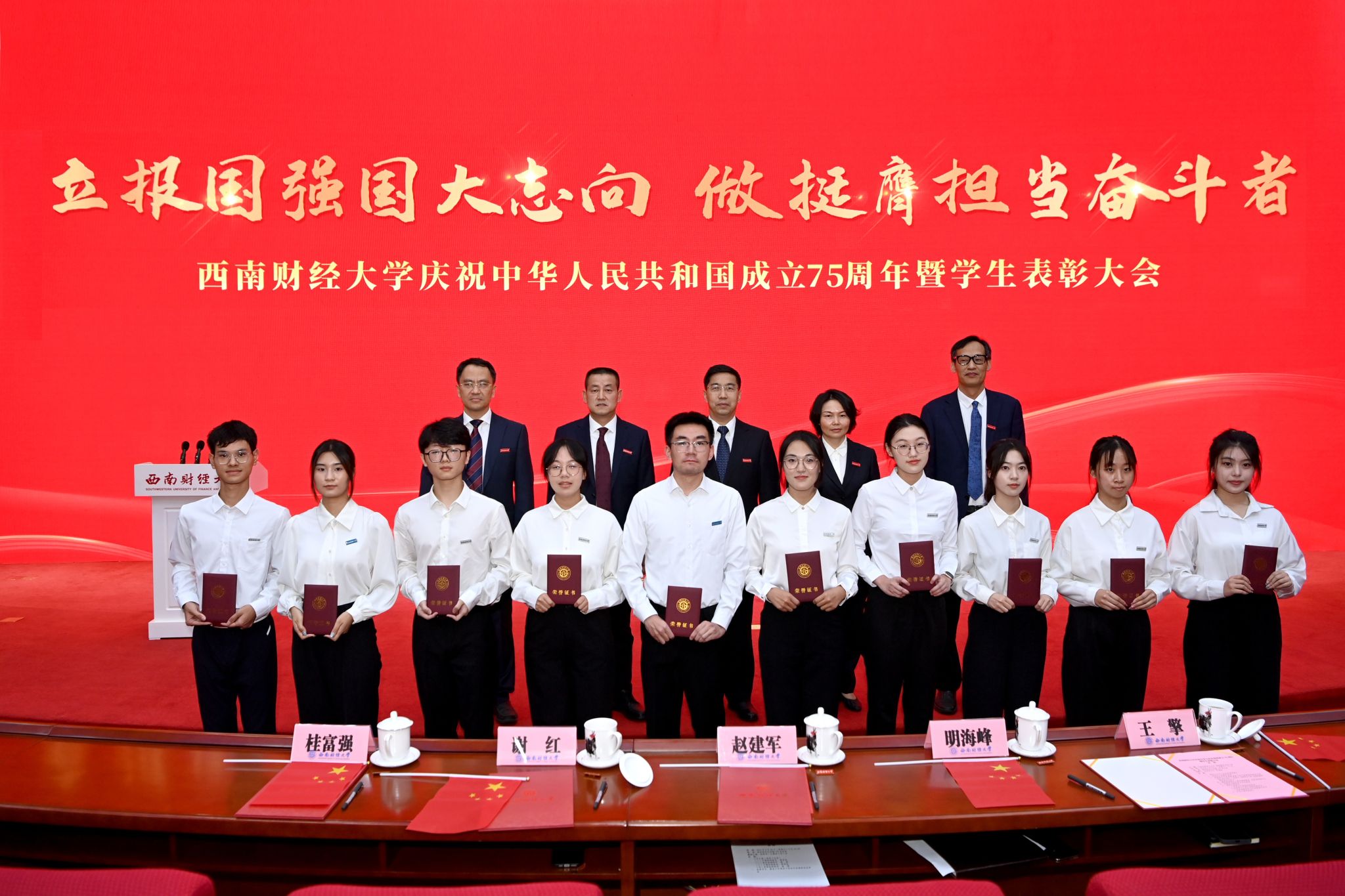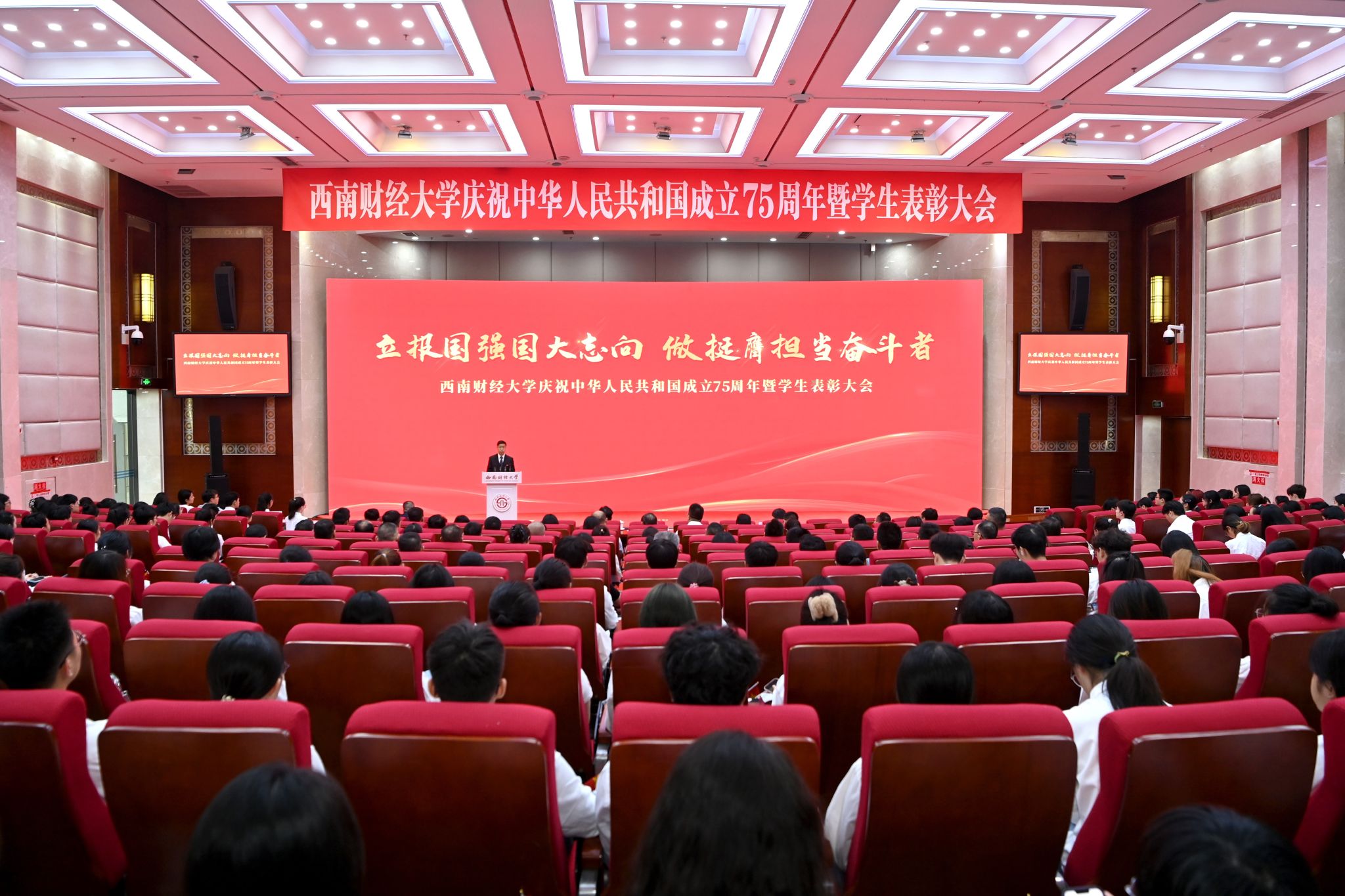 萬眾歡騰歌盛世,共祝祖國更輝煌。9月29日下午,西南財經大學在柳林校區弘遠樓105報告廳舉行大會,隆重慶祝中華人民共和國成立75周年,表彰一批學生先進集體和優秀個人。黨委書記趙建軍,黨委副書記謝紅、明海峰,黨委常委、副校長桂富強、王擎出席大會。