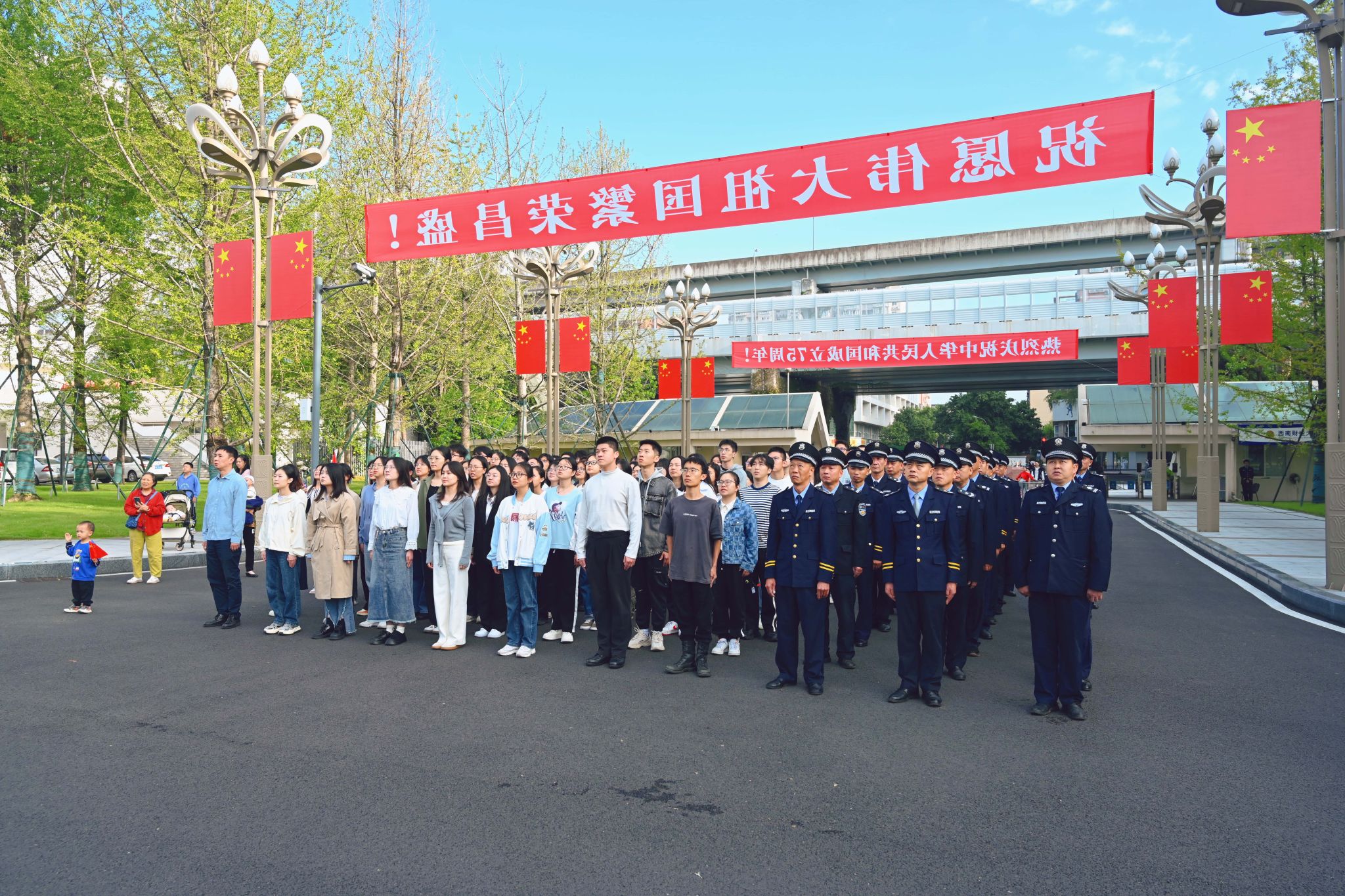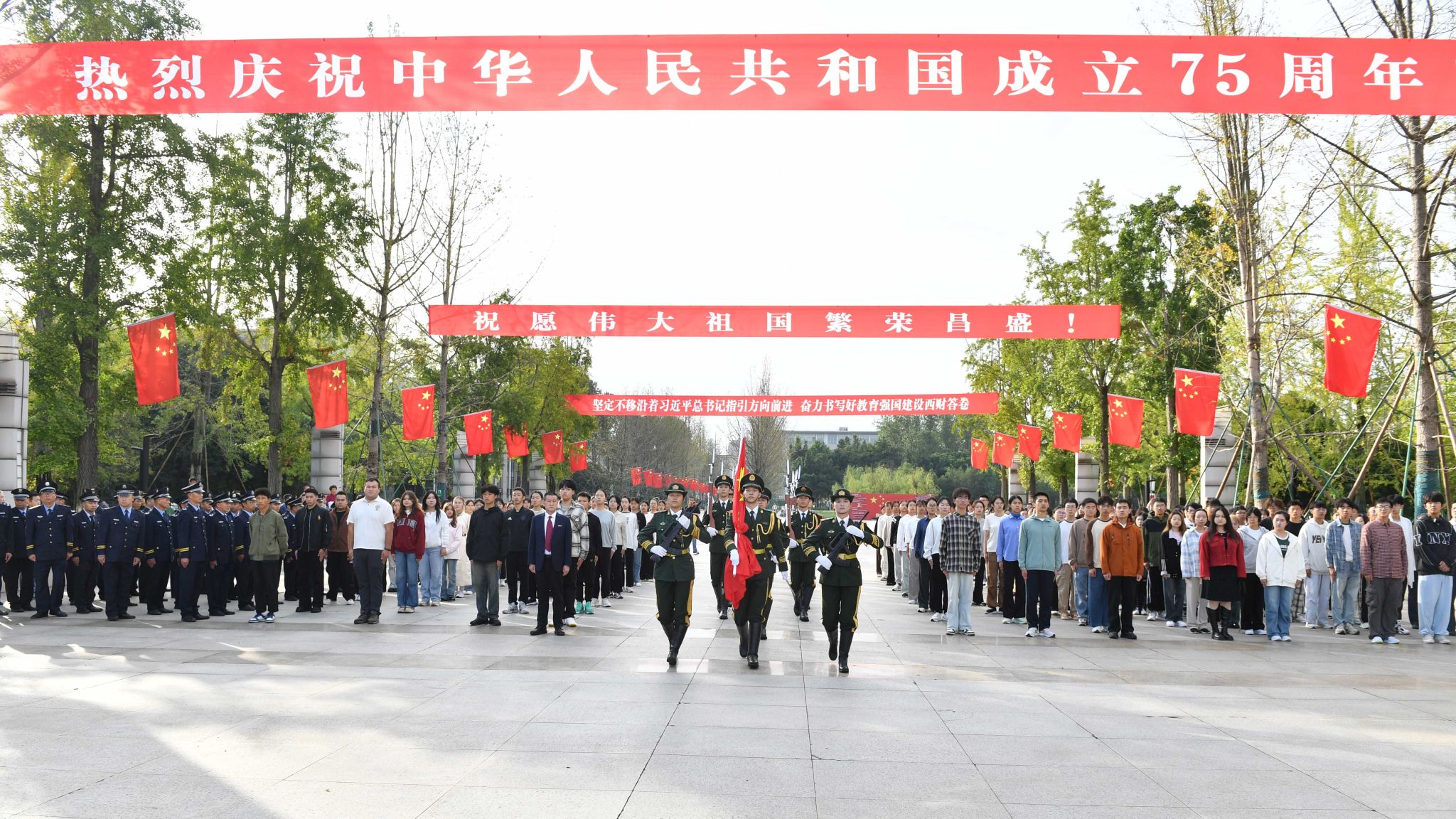 伴隨著雄壯激昂的《義勇軍進行曲》,五星紅旗冉冉升起,那一抹飄揚在長空里的中國紅,點燃每一個西財人的愛國心、報國情、強國志。師生們目光如炬,共同凝視著那面代表著國家尊嚴與榮耀的五星紅旗,共同祝愿祖國繁榮昌盛,人民幸福安康!