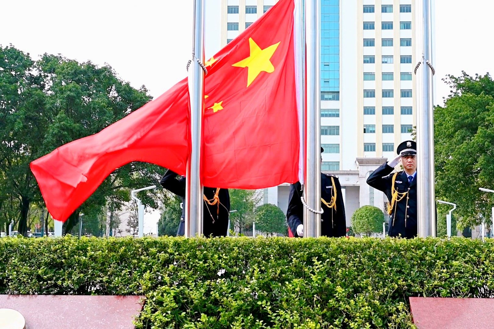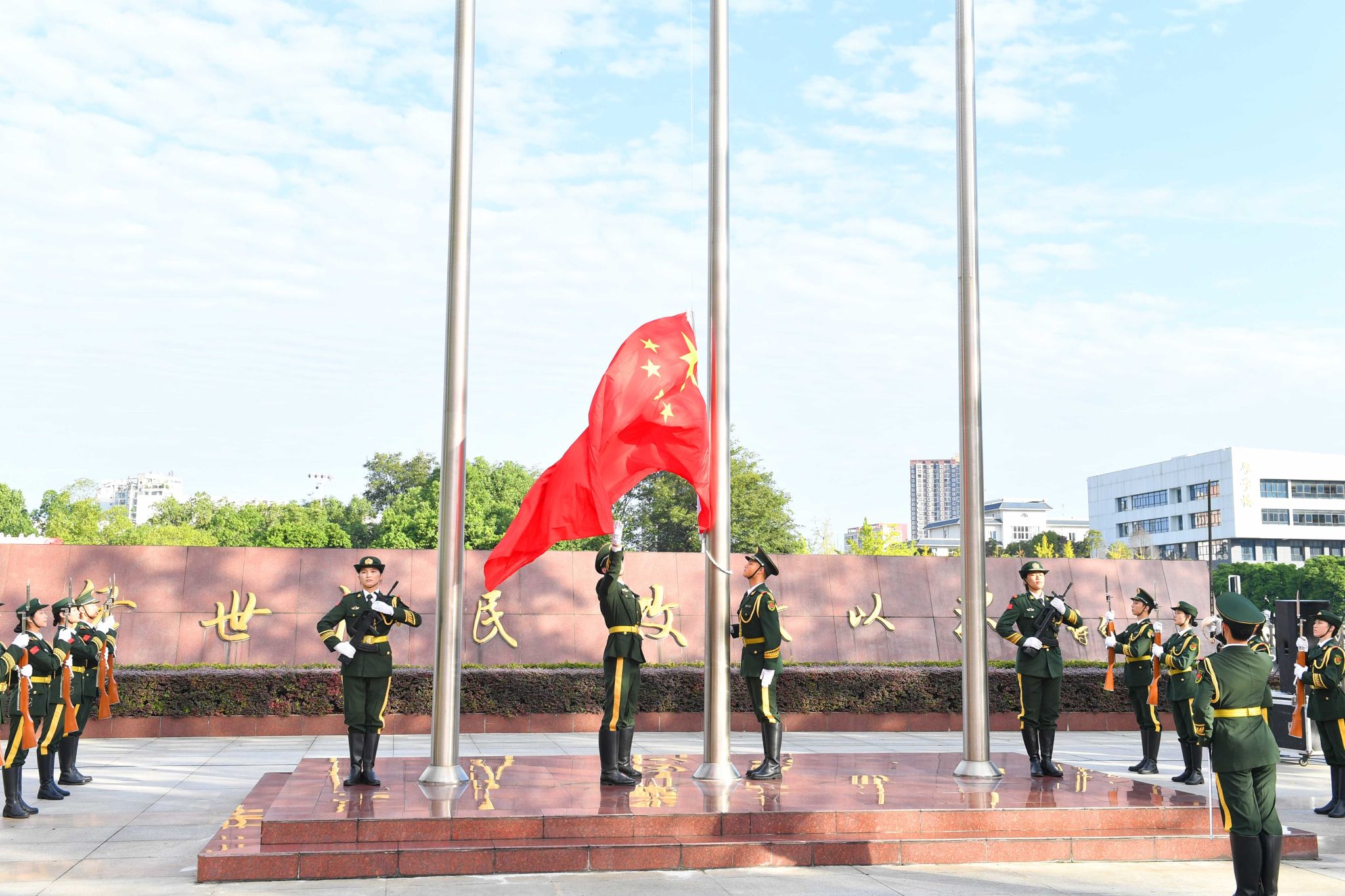8時30分,身著整齊制服的升旗手和護旗隊員,以挺拔的身姿、鏗鏘的步伐,護送著國旗走向升旗臺,每一步都是對祖國清澈堅定的愛。