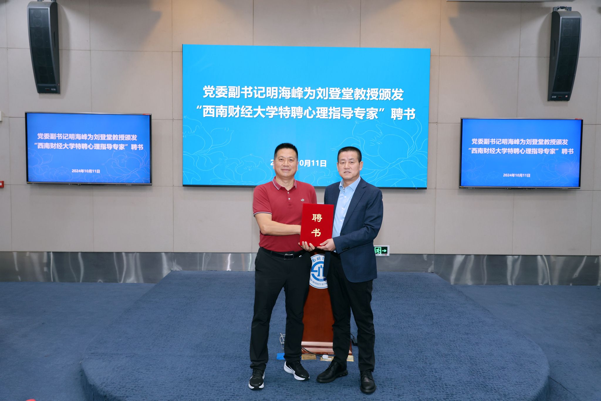 會上,明海峰為劉登堂頒發(fā)“西南財經(jīng)大學(xué)特聘心理指導(dǎo)專家”聘書。