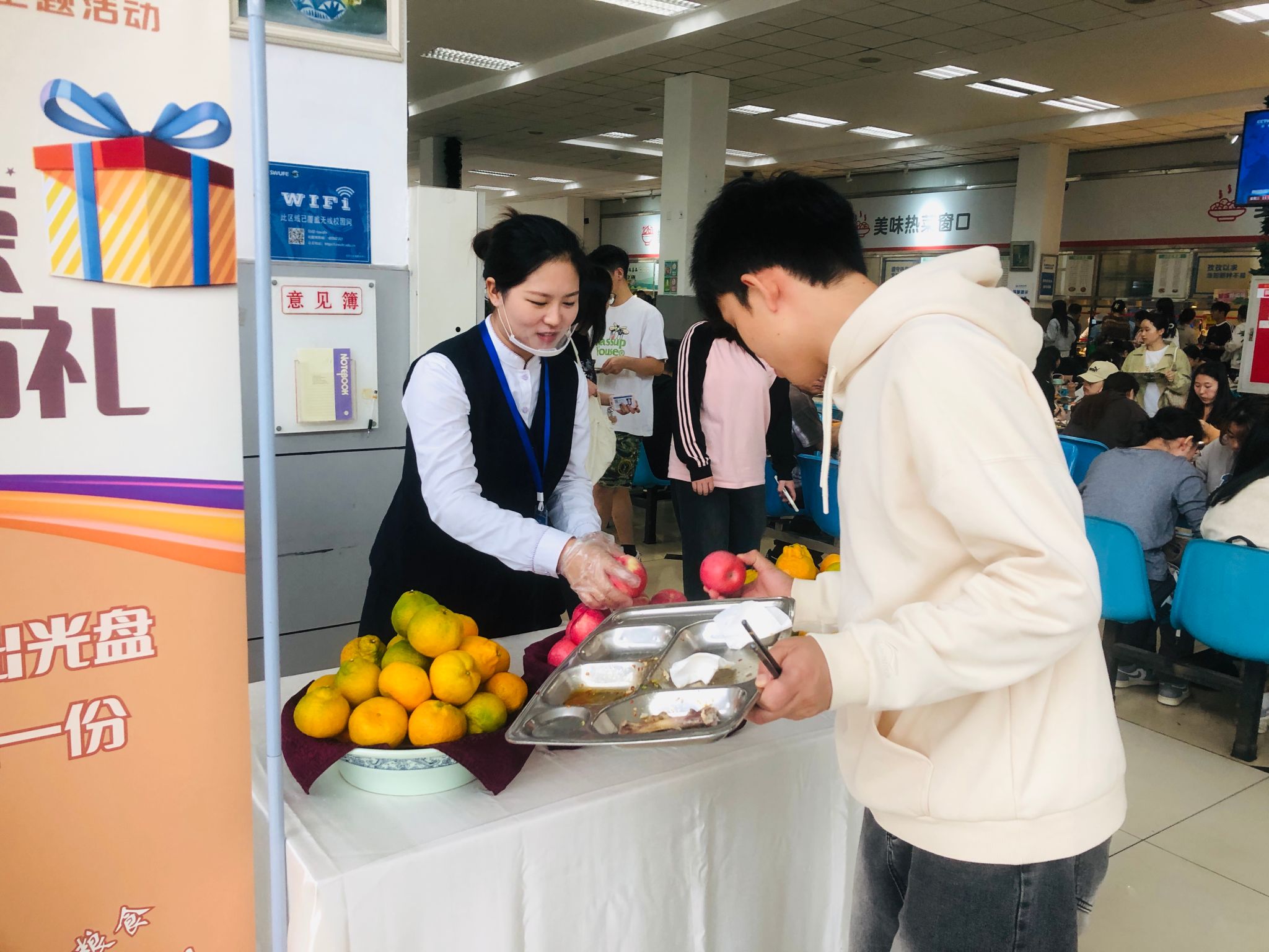 為鼓勵師生“餐餐光盤”,倡導師生“從我做起”,在午餐時段,學校組織開展“光盤行動,禮贊節約”兌換活動。各食堂均設立“光盤”打卡點,提倡節儉節約生活方式,并以兌換水果作為獎勵。組建光盤監督崗學生志愿者隊伍,提醒師生按量取餐,不剩飯、不剩菜,積極倡導文明用餐。師生們踴躍參與,爭做勤儉節約、珍惜糧食的傳承者、實踐者和引領者。