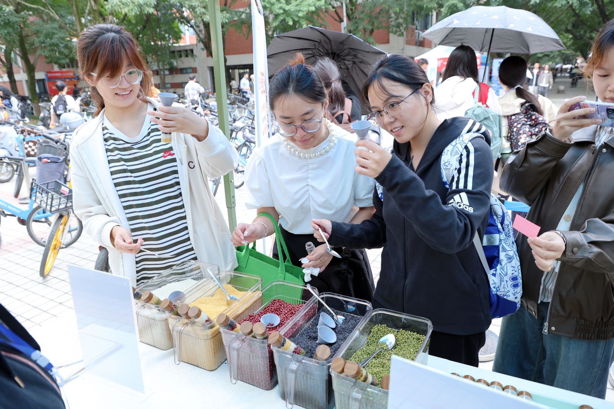 活動當天,柳林校區五谷堂外熱鬧非凡,一場別開生面的“識谷辨糧,樂享豐收”主題游園活動吸引眾多師生參與。同學們在輕松愉快的氛圍中通過農作物圖片辨識各類糧食,了解它們的生長過程和營養價值,并親手用大米、小米、紅豆、綠豆等糧食制作“豐收瓶”,寓教于樂學農事,融學于趣識五谷,身體力行惜糧食,切實感悟“一粥一飯,當思來之不易”,加深節糧及反食品浪費認識。