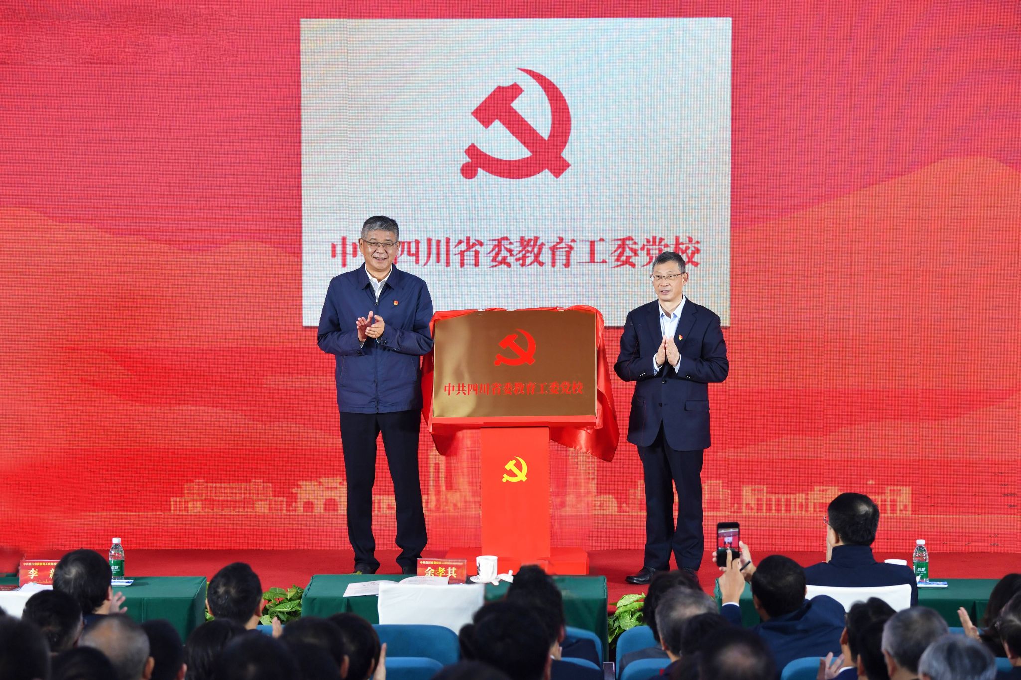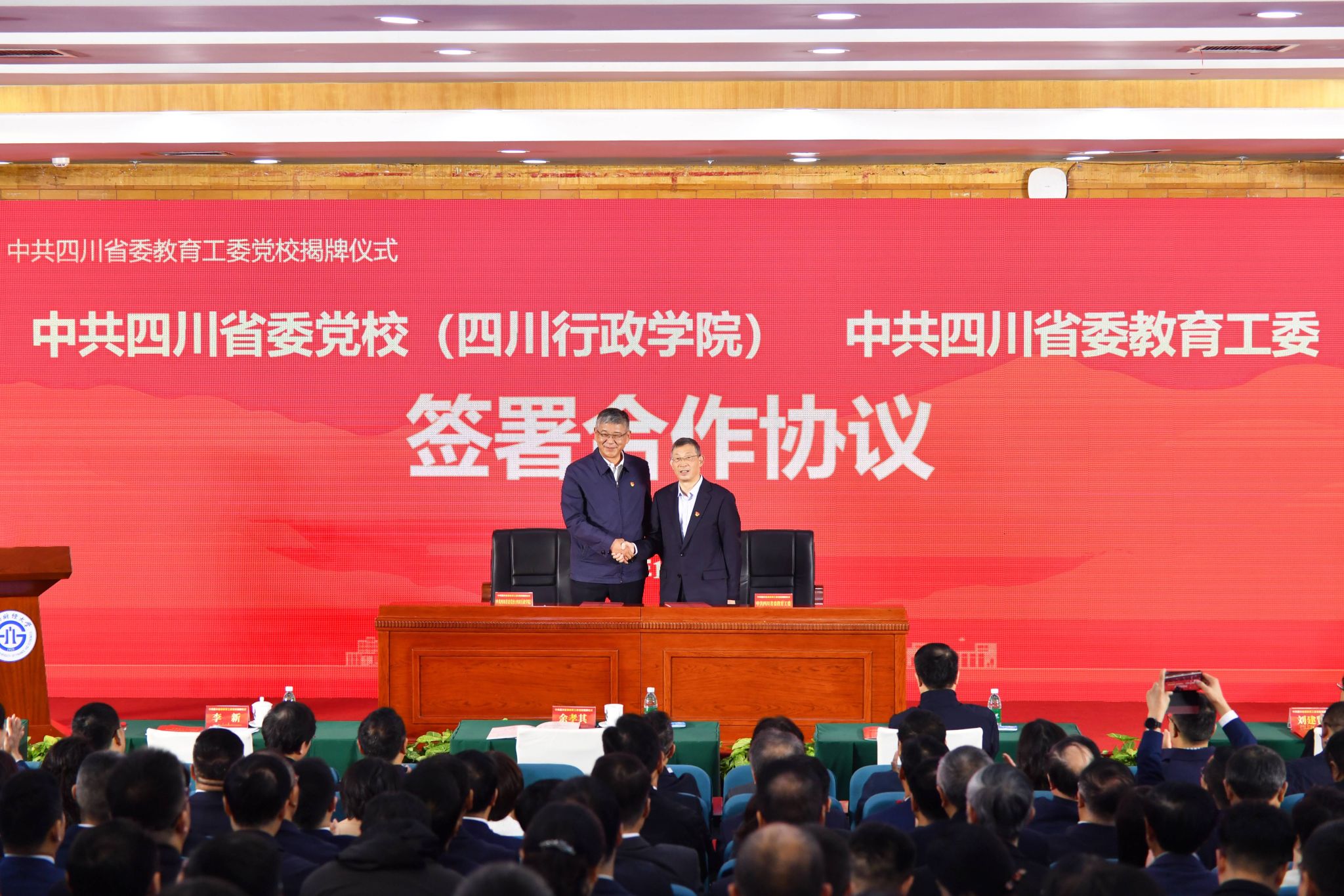 余孝其、李新共同為“中共四川省委教育工委黨?!苯遗?,并分別代表省委教育工委與省委黨校(四川行政學院)簽訂合作框架協議。省委教育工委還將與國家教育行政學院、小平干部學院、四川兩彈一星干部學院以及四川大學等高校干部教育培訓基地等單位簽訂合作協議。