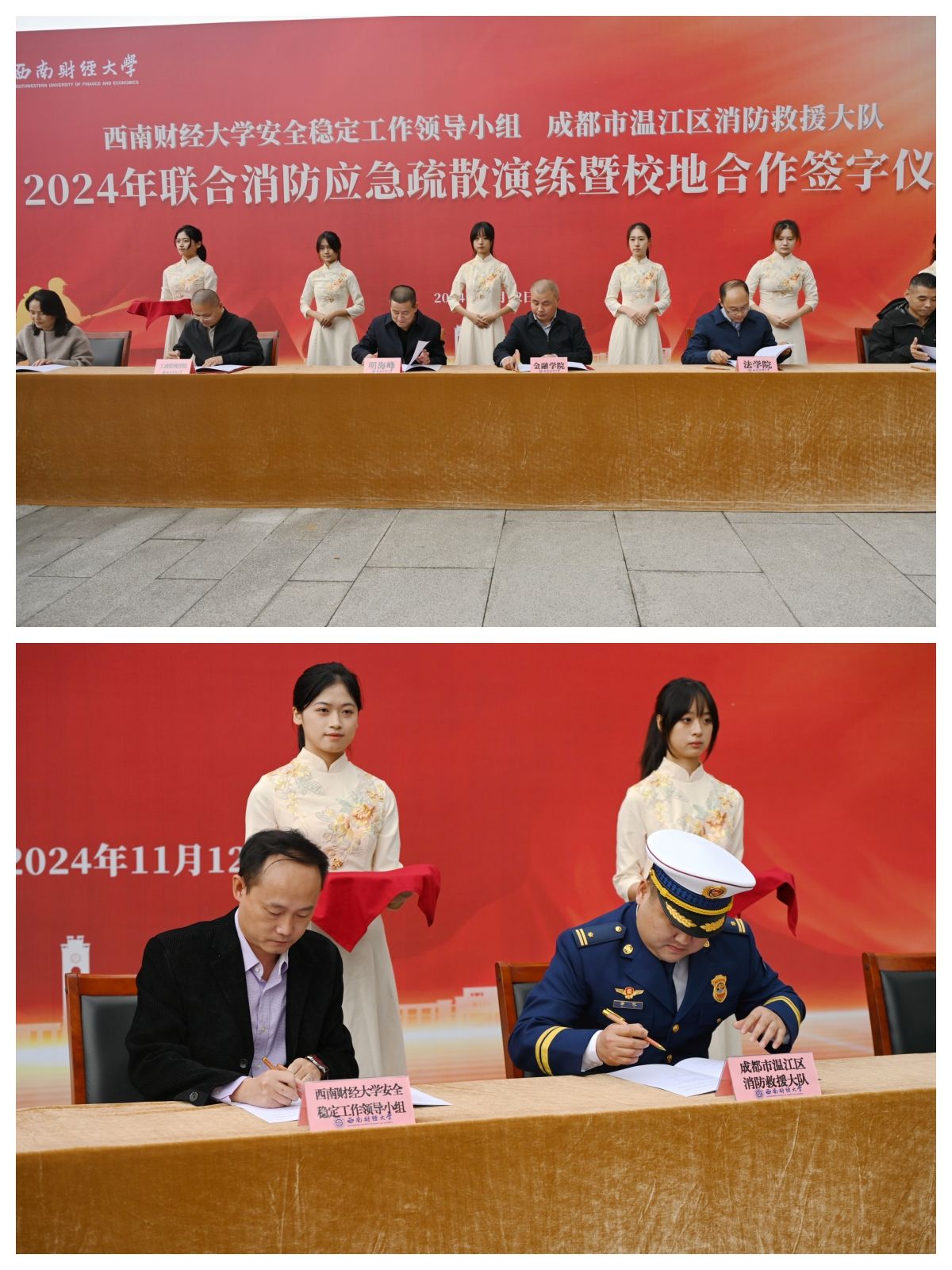11月12日下午,學校與溫江消防救援大隊2024年消防應急疏散演練暨《合作共建協議》簽約儀式在柳林校區誠正樓前廣場舉行。黨委副書記明海峰出席活動并擔任演練總指揮,成都市溫江區消防救援大隊副大隊長蒲億,學校相關職能部門、學院(研究院)負責人和師生代表300余人參加。