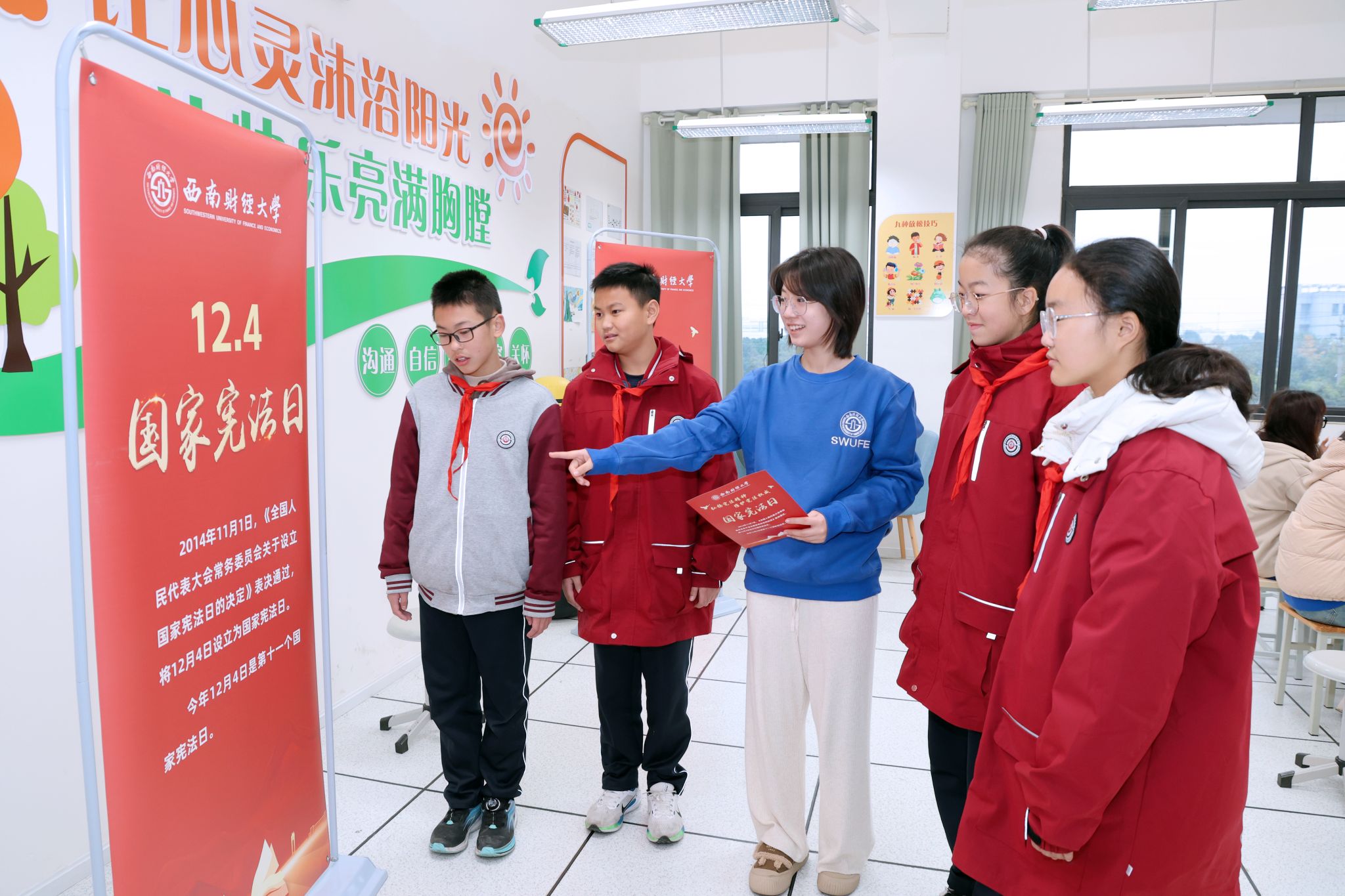 12月4日是第十一個(gè)國(guó)家憲法日。為深入學(xué)習(xí)踐行習(xí)近平法治思想,認(rèn)真貫徹黨的二十大和二十屆二中、三中全會(huì)以及全國(guó)教育大會(huì)精神,加強(qiáng)憲法法治教育,12月4日上午,國(guó)家憲法日教育系統(tǒng)“憲法晨讀”活動(dòng)舉行。教育部在北京設(shè)主會(huì)場(chǎng)。學(xué)校在柳林校區(qū)劉詩(shī)白書院“一站式”學(xué)生社區(qū)和西南財(cái)經(jīng)大學(xué)附屬實(shí)驗(yàn)中學(xué)設(shè)分會(huì)場(chǎng)。