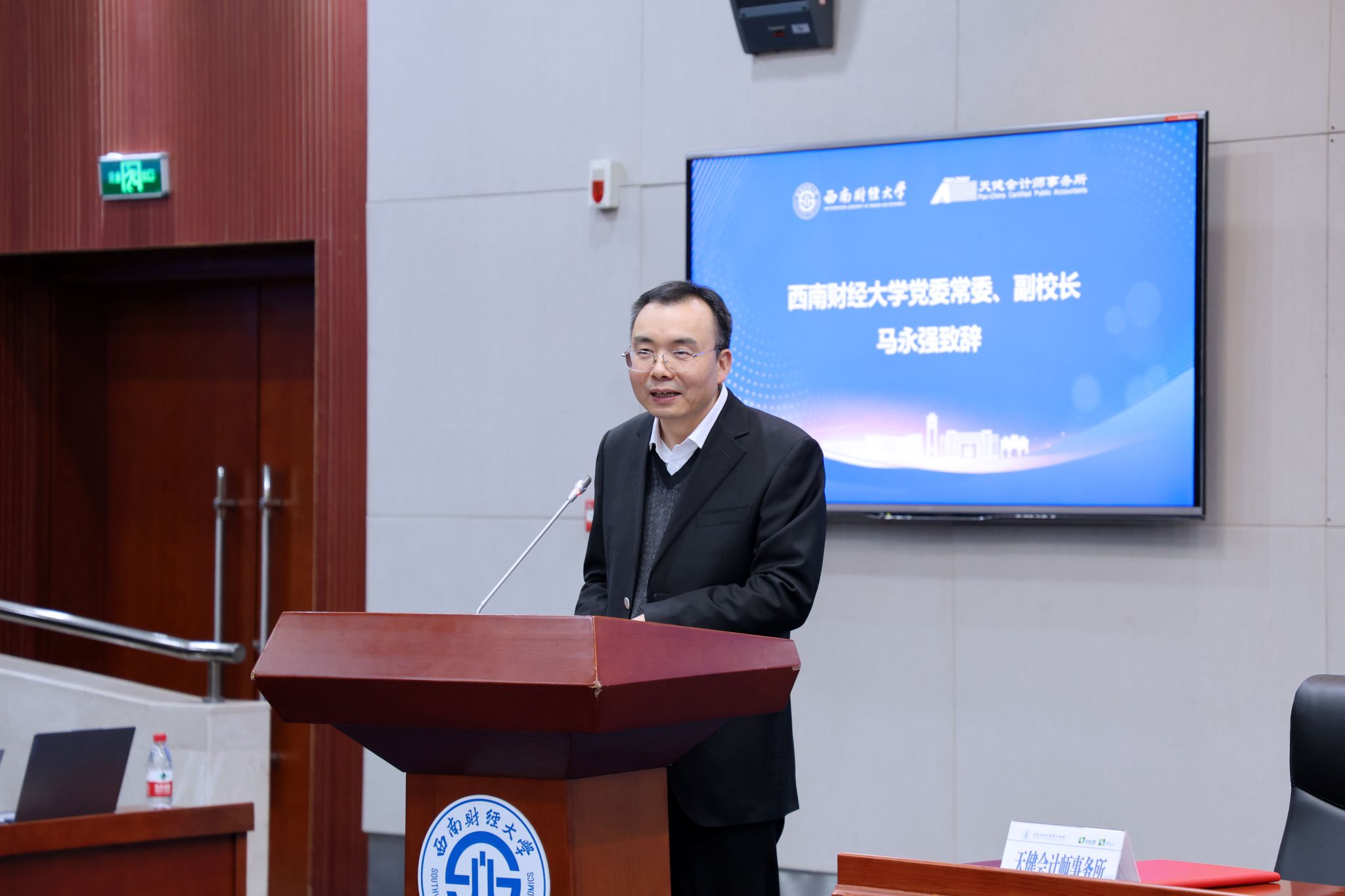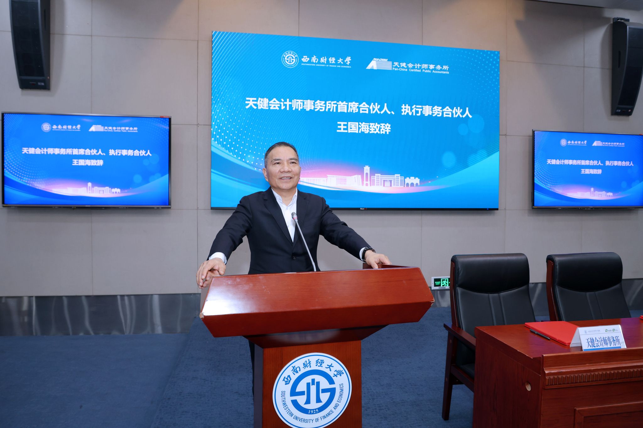 王國海介紹了天健會計師事務所基本情況,希望未來與學校發揮各自優勢,共同圍繞人才培養、科學研究、社會服務等方面開展合作,共同推動財經教育和會計審計行業創新發展。