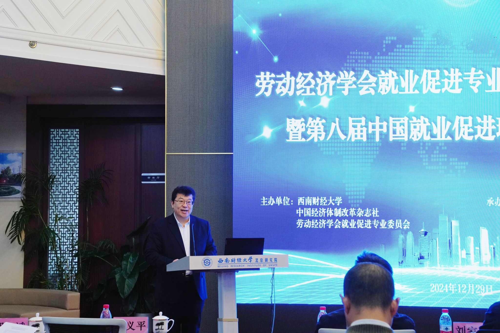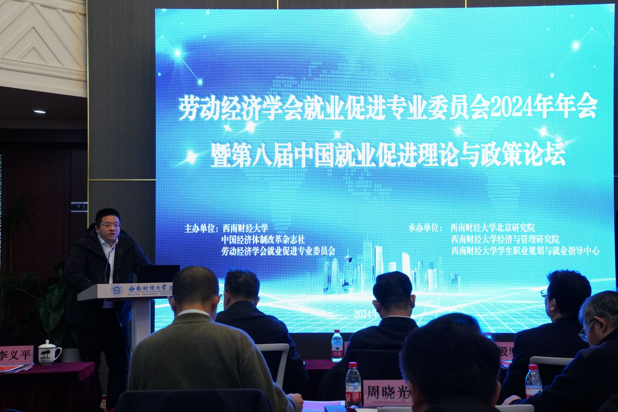 2024年12月29日,勞動經濟學會就業促進專業委員會年會及第八屆中國就業促進理論與政策論壇在北京成功舉辦,會議以“高質量經濟發展促進高質量充分就業”為主題,由西南財經大學、中國經濟體制改革雜志社及勞動經濟學會就業促進專業委員會(以下簡稱專委會)聯合主辦。西南財經大學黨委副書記、紀委書記孫殿明,中國經濟體制改革雜志社總編輯劉學軍,勞動經濟學會常務副秘書長周曉光出席會議并分別代表主辦方致辭。西南財經大學教授劉家強,中國勞動和社會保障科學研究院院長莫榮,北京市社會科學院黨組副書記、副院長楊偉國,中國人民大學經濟學院教授李義平等在會上作主旨演講。來自國家發改委、教育部、人社部、國家統計局、中國社會科學院、北京大學、清華大學、中國政法大學、北京交通大學、華東師范大學、西南財經大學、首都經貿大學、浙江工商大學、云南大學、中國人口與發展研究中心、中國人事科學研究院、美團、滴滴出行、北京零點有數數據公司等政府、高校、科研機構、企業的專家學者,以及來自新華社、光明日報、經濟日報、中國財經報、中國發展改革報、21世紀經濟報道、財新等媒體嘉賓出席會議。