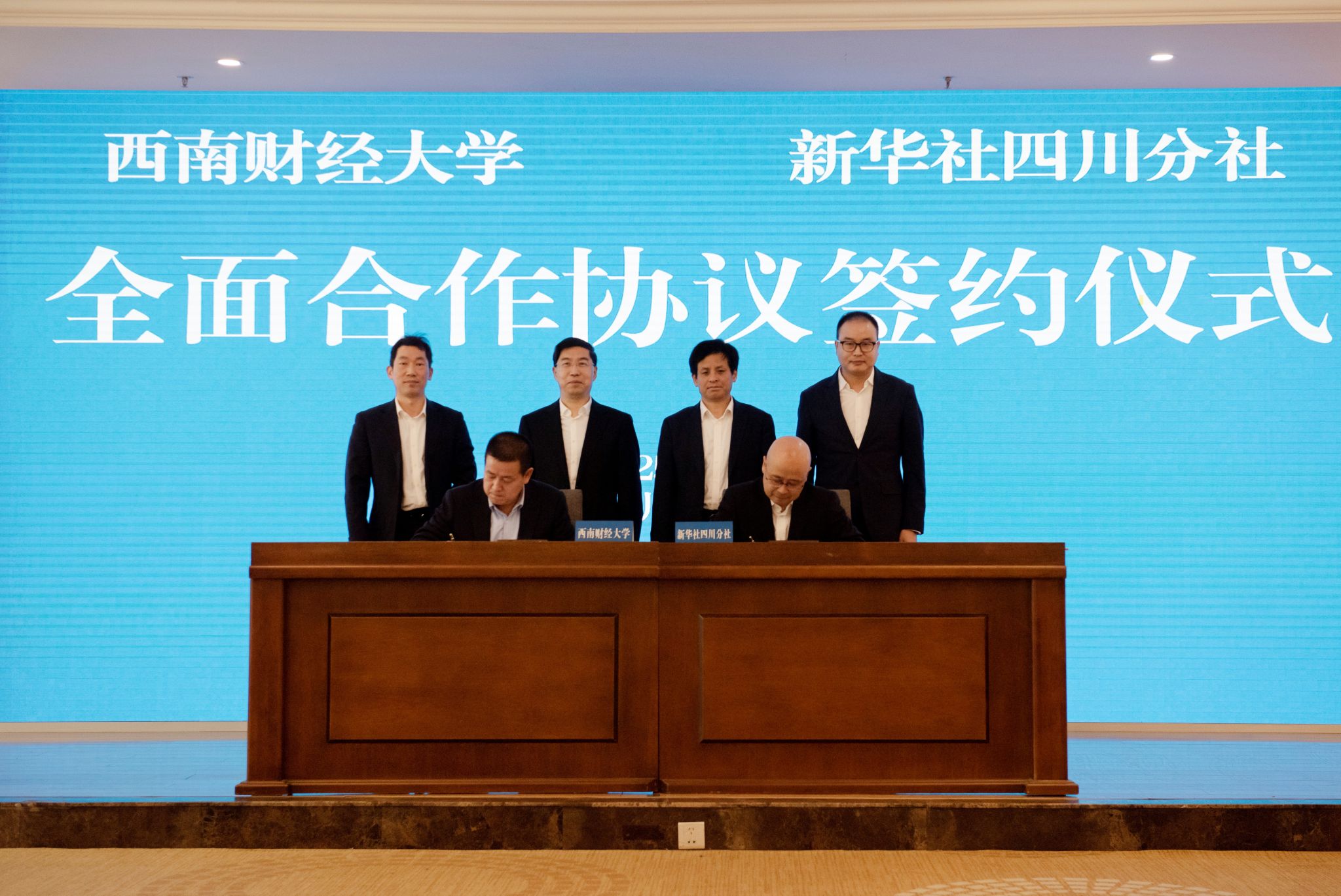 新華社四川分社分黨組成員、新華社新聞信息中心四川中心主任余斌,學校黨委副書記明海峰代表雙方共同簽署全面合作協議。