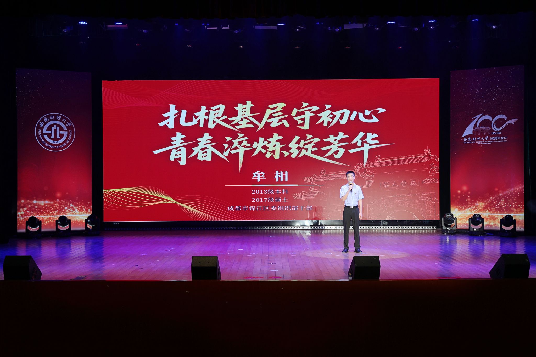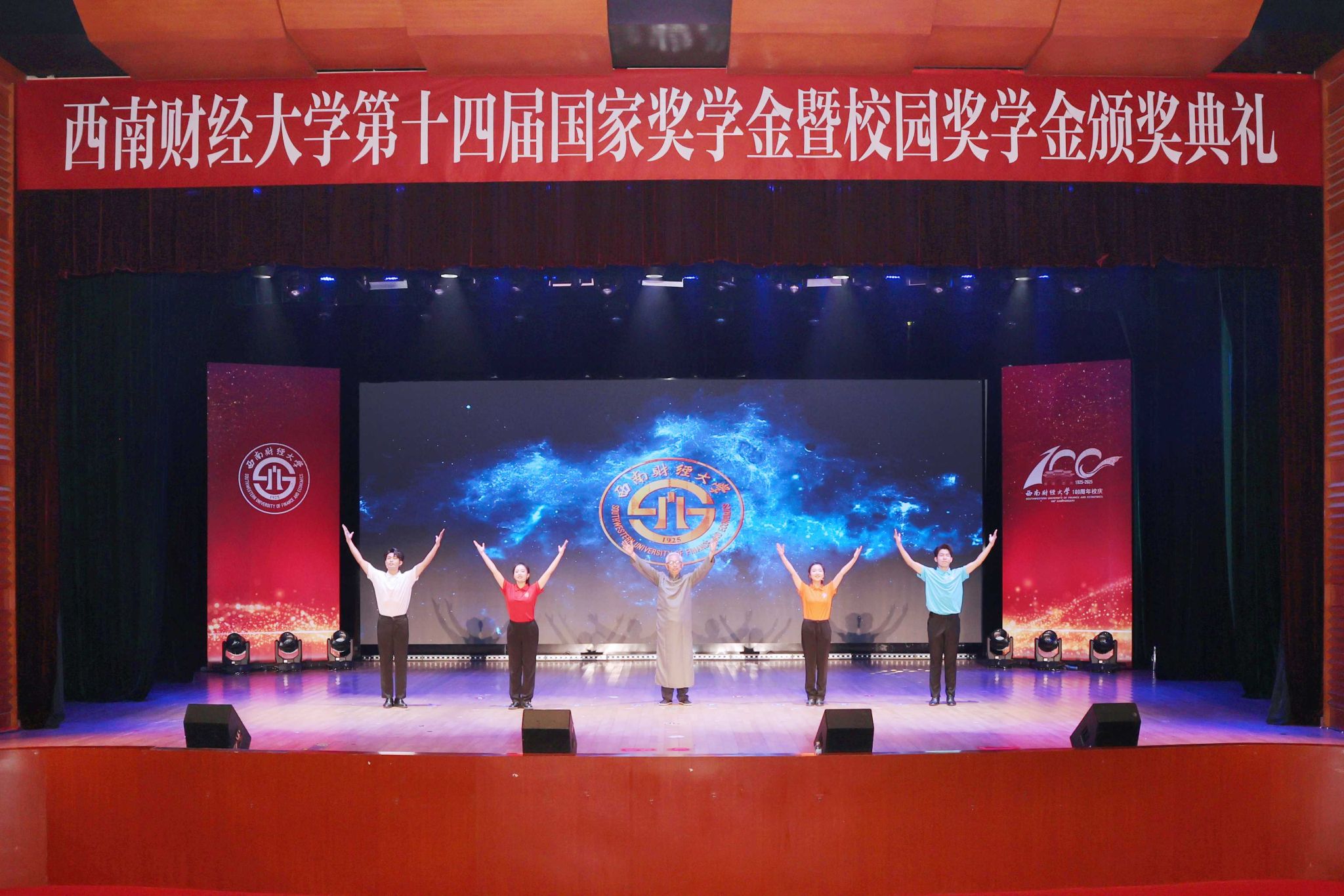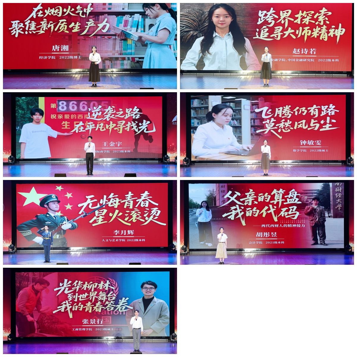 本屆頒獎典禮創新典禮形式,以篇章呈現,表彰一批在建校100周年之際,立足新財經、勇擔新使命、展現新作為的西財青年榜樣。他們中的代表有用腳步丈量祖國大地,在煙火中聚焦新質生產力研究的唐湘;跨界探索,追尋大師精神的趙詩若;在平凡中尋光逆襲的王金宇;勵志前行,傳遞愛意的鐘敏雯;用火紅青春譜寫國旗禮贊的李月輝;跟隨父親腳步,夢圓西財的“財二代”胡彤昱;在國際舞臺展現西財青春風采的張景行。典禮上,2015年參加國獎頒獎典禮的校友牟相重返舞臺,講述成長故事、感恩母校栽培、獻禮百年華誕。退休教師江林旭與學生聯合傾情呈現時空對話節目《百年弦歌 薪火相傳》,回望光華歲月、傳承西財精神。