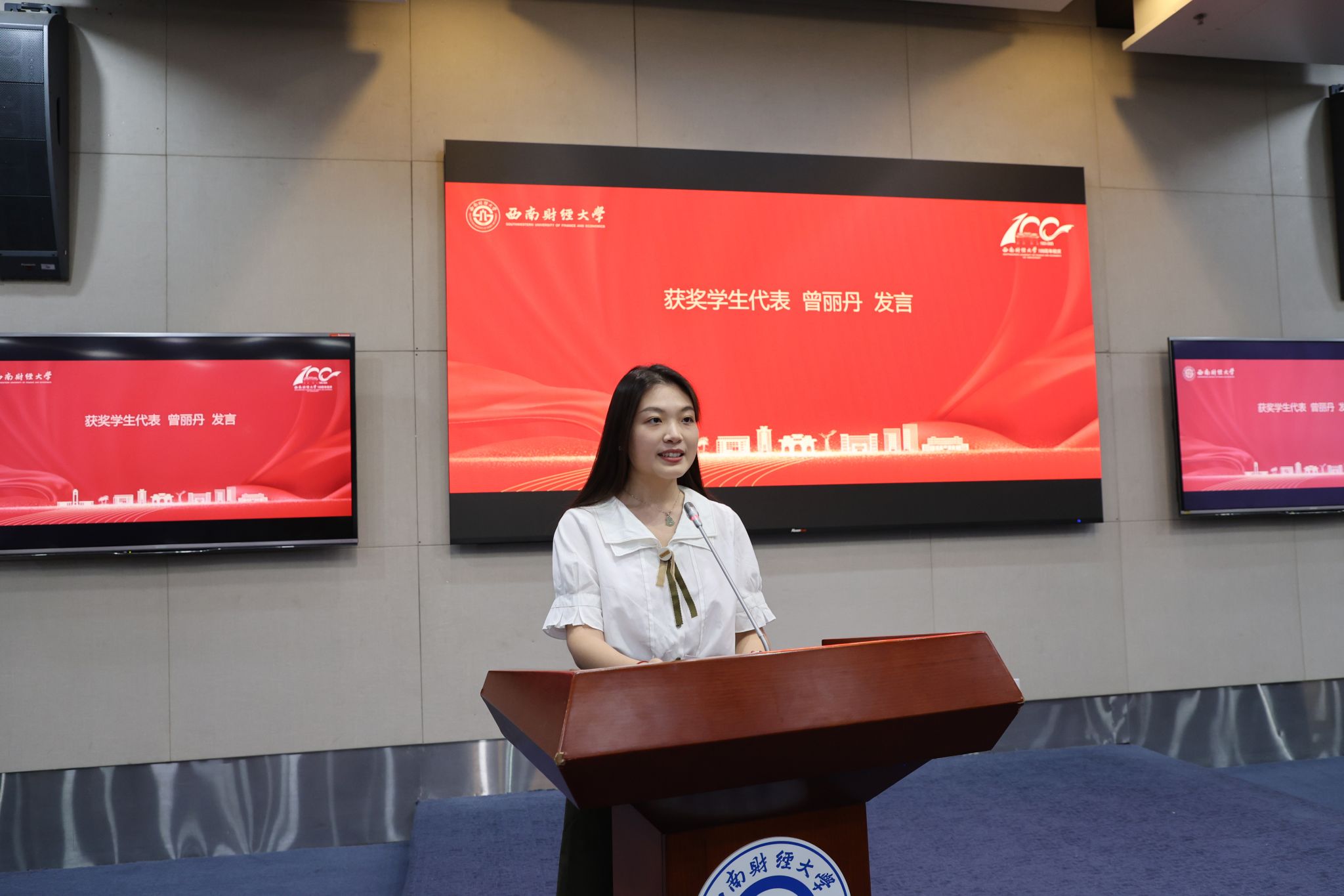 獲獎同學代表、金融學院2022級博士研究生曾麗丹在發言中表示,學校百年華誕之際獲此殊榮既是榮譽也是責任,她將傳承曾康霖教授“扎根中國、以民為本”的治學精神,深入金融風險管理研究,踐行西財人投身金融強國建設的使命擔當。