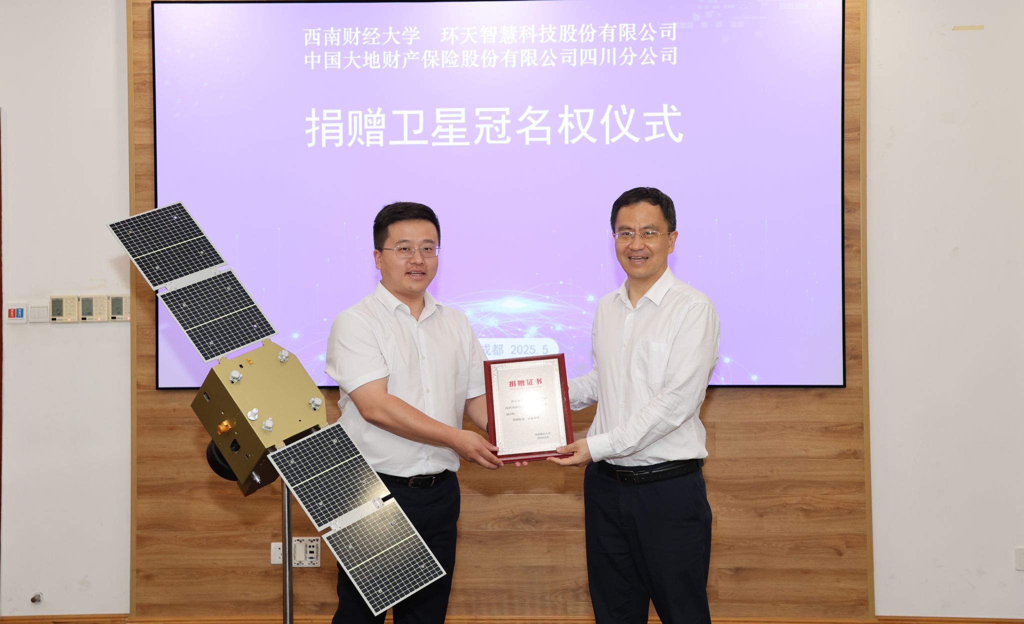 衛星冠名儀式上,環天智慧向學校捐贈衛星冠名權和模型,學校頒發捐贈證書。此次合作是對西南財大的科技獻禮,開創了金融保險跨界融合新模式,將為加速我國保險業數字化、智能化轉型,加快金融強國建設注入新動能。