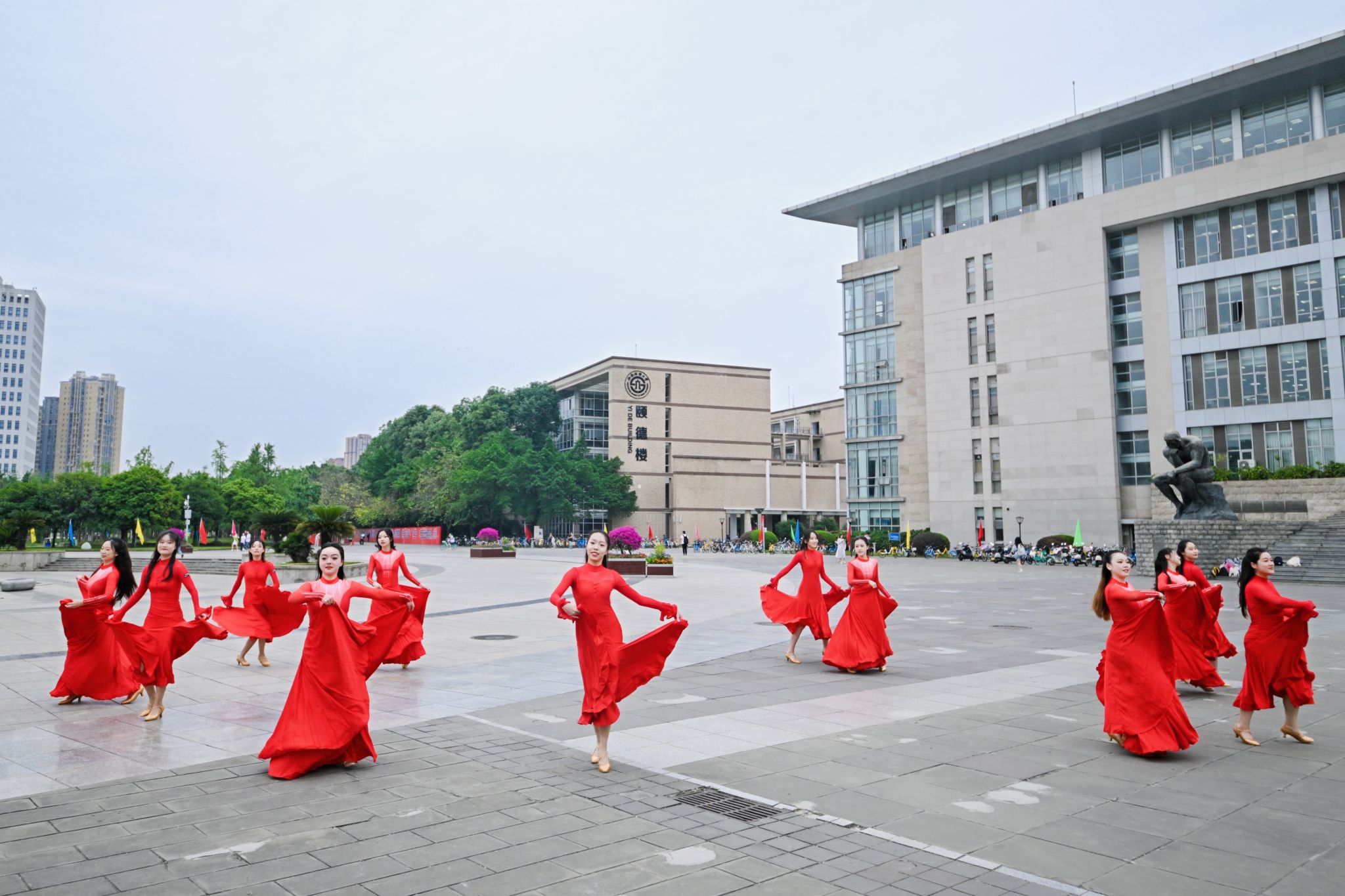 隊伍環繞濟民廣場而行,10余位西財師生身著紅裙翩翩起舞,裙擺飛揚間、激昂樂音中,盡顯對學校百年華誕的熱忱慶賀。經世樓前,年輕的朋友們列隊為大家加油鼓勁,鞭策著全體西財人以更加飽滿的姿態啟航新百年。道路兩側彩旗獵獵,師生們步履鏗鏘,滿懷加快建設財經特色鮮明的世界一流大學,為加快建設教育強國、金融強國貢獻更大西財力量的壯志豪情迎向勝利的終點。