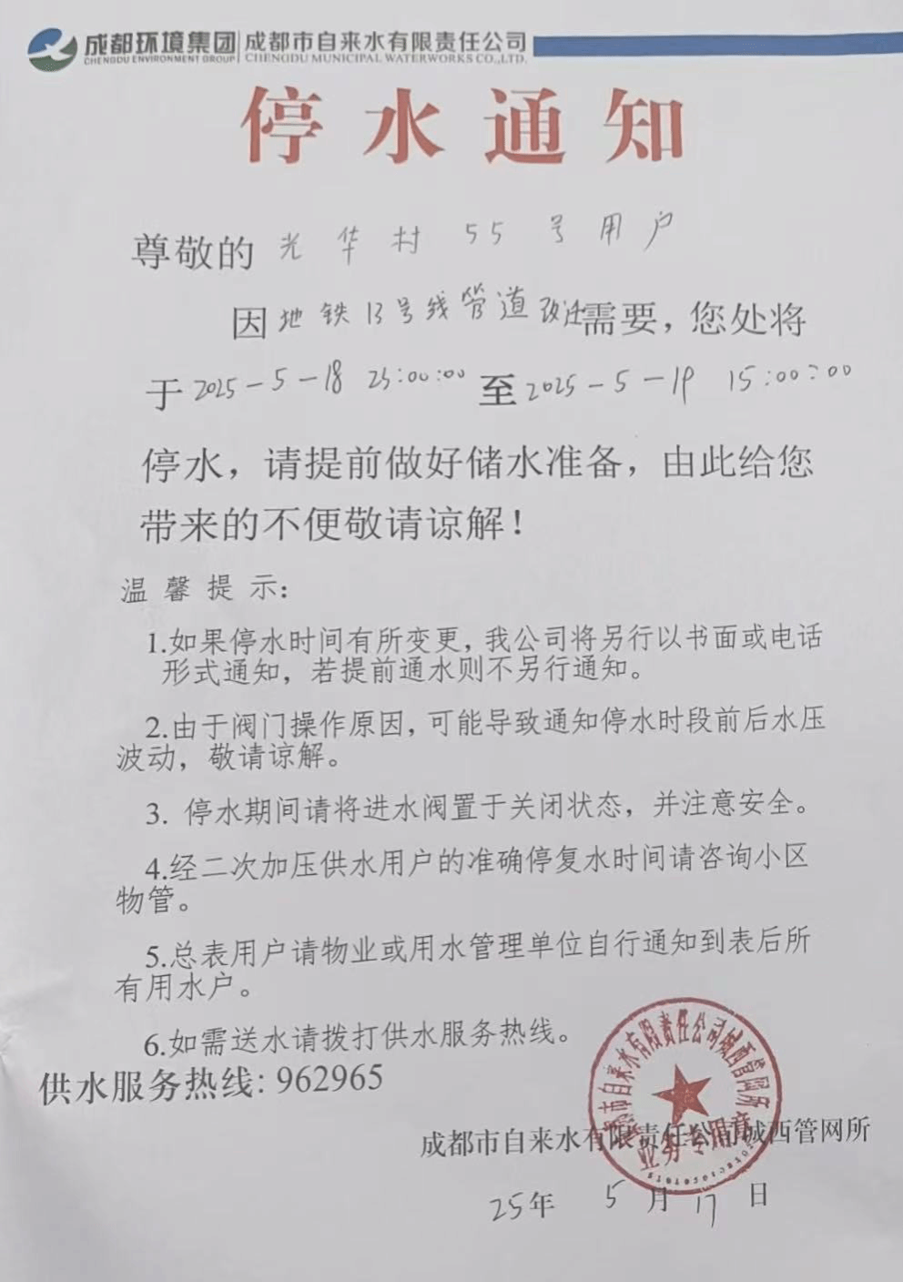 接成都市自來(lái)水有限公司通知,因地鐵13號(hào)線管道改遷需要,學(xué)校光華校區(qū)將于2025年5月18日(星期日)23:00——2025年5月19日(星期一)15:00停水,請(qǐng)?zhí)崆白龊脙?chǔ)水準(zhǔn)備,由此給您帶來(lái)的不便敬請(qǐng)諒解!