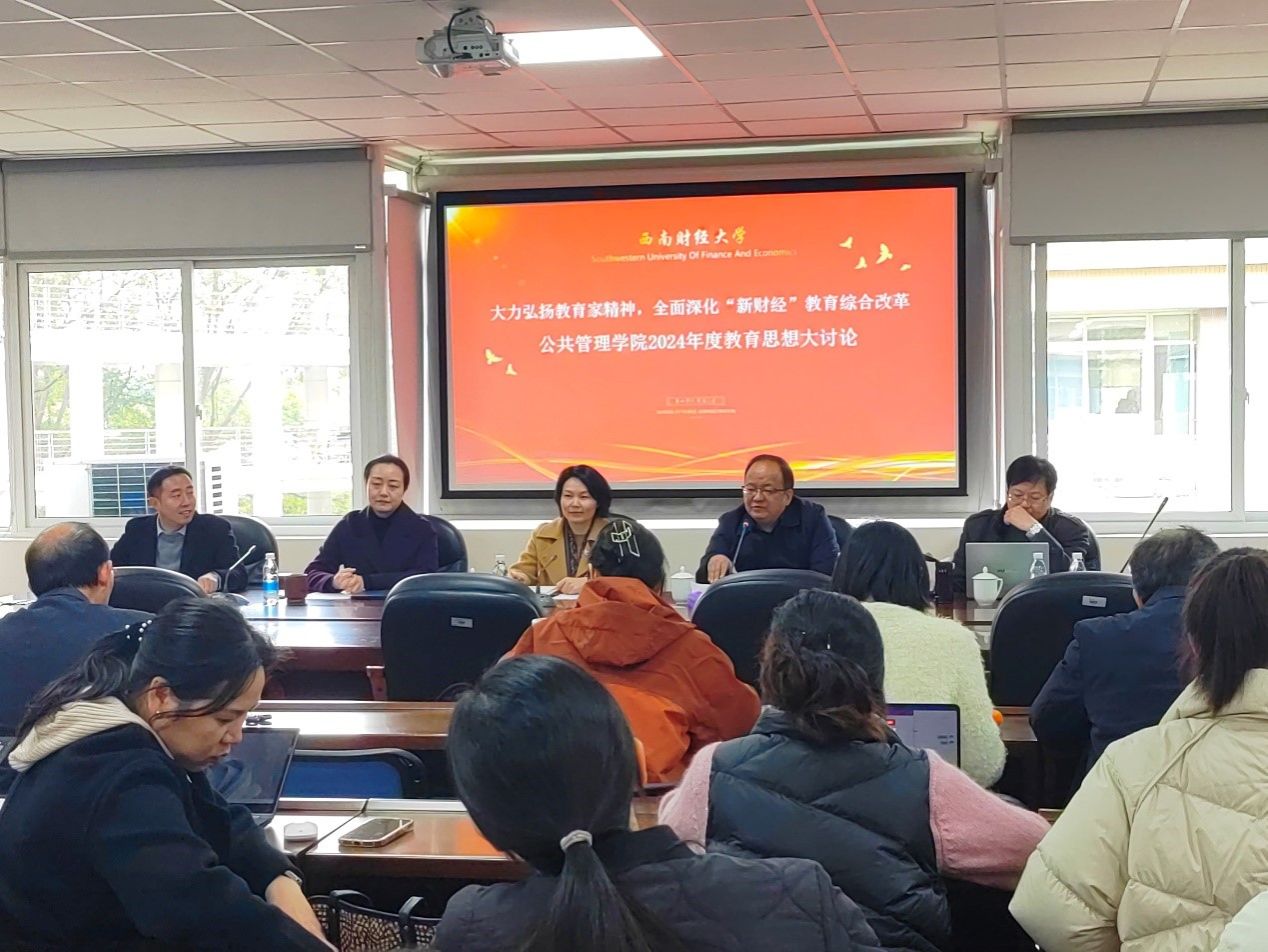 近日,公共管理學院開展以“大力弘揚教育家精神 全面深化‘新財經’教育綜合改革”為主題的2024年教育思想大討論。學校黨委副書記謝紅,學院全體教職員工參加了本次會議。會議由學院院長廖宏斌主持。