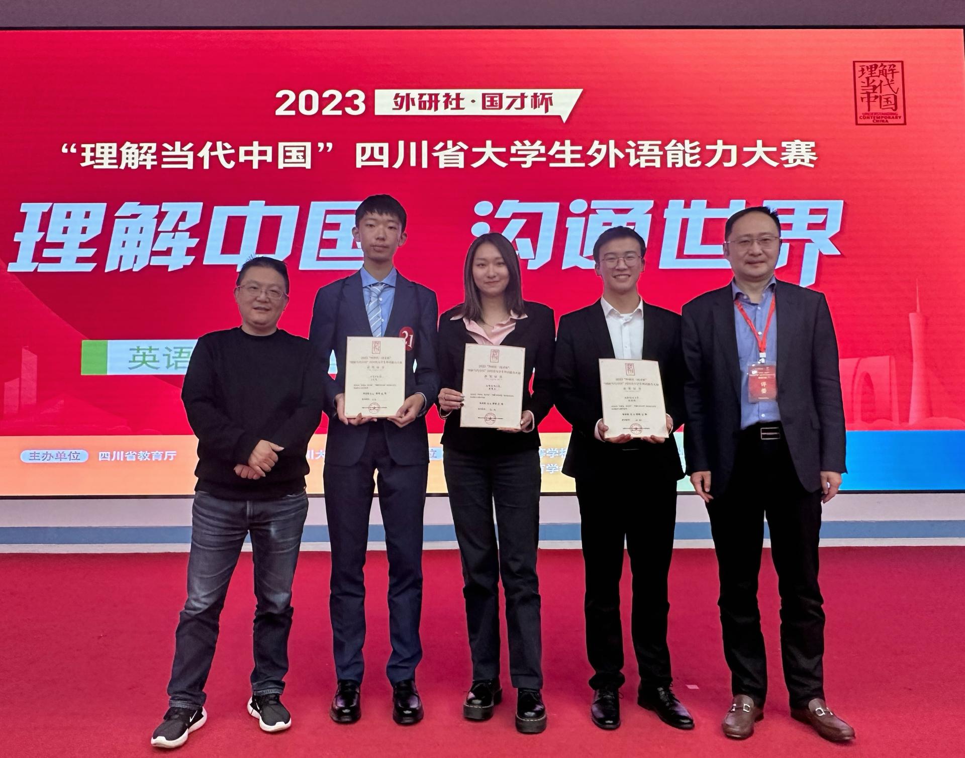 11月6日,2023“外研社·國(guó)才杯”“理解當(dāng)代中國(guó)”全國(guó)大學(xué)生外語(yǔ)能力大賽四川省復(fù)賽于四川大學(xué)望江校區(qū)正式舉行。在外國(guó)語(yǔ)學(xué)院孫林老師的指導(dǎo)下,我校學(xué)子2023級(jí)英語(yǔ)口譯專業(yè)胡盛強(qiáng)、2022級(jí)會(huì)計(jì)學(xué)(中外合作辦學(xué))黃楚玉、2023級(jí)會(huì)計(jì)學(xué)(中外合作辦學(xué))呂呈悅經(jīng)過兩輪鏖戰(zhàn),以其清晰的思路、嚴(yán)密的邏輯、生動(dòng)的語(yǔ)言、自如的表達(dá)最終斬獲佳績(jī)。黃楚玉榮獲全場(chǎng)冠軍,胡盛強(qiáng)榮獲金獎(jiǎng),成功晉級(jí)全國(guó)總決賽,呂呈悅榮獲四川省銀獎(jiǎng)。