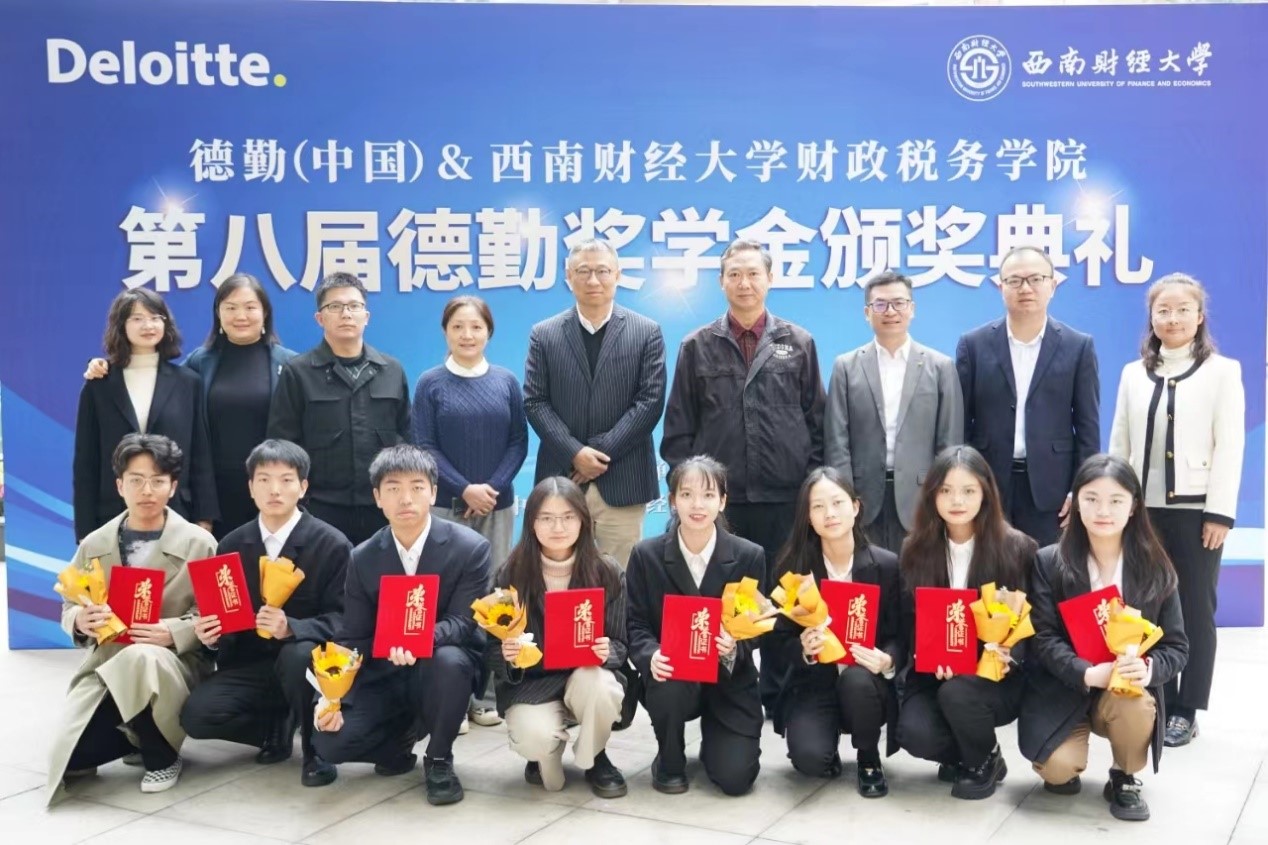 2023年11月18日,第八屆德勤獎學金頒獎典禮在西南財經大學光華校區隆重舉行。德勤(中國)稅務與商務咨詢華西區主管合伙人湯衛東先生、德勤(中國)稅務與商務咨詢合伙人張書、高級經理王蓓,財政稅務學院院長何加明、黨委書記吳春力、副書記王隆慶等出席本次頒獎儀式。