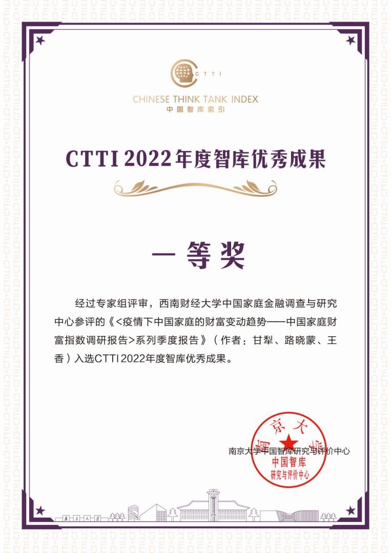 12月17日,“2022新型智庫治理論壇”在南京舉行。我校中國家庭金融調(diào)查與研究中心《疫情下中國家庭的財富變動趨勢——中國家庭財富指數(shù)調(diào)研報告》系列季度報告獲CTTI2022年度智庫研究精品成果獎。我校中國家庭金融調(diào)查與研究中心自2018年入選首批“CTTI高校智庫百強榜”后,已連續(xù)4年獲CTTI年度智庫研究精品成果獎。