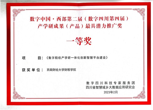 2023年2月19日,數字中國·西部院士專家論壇暨省大研會第一屆第五次代表大會在成都成功召開。會上,財稅學院數字財稅團隊與國家稅務總局四川省稅務局晏燕工作室聯合申報的《數字稅收產學研一體化創新智慧平臺建設》項目被表彰為“數字中國·西部第二屆(數字四川第四屆)產學研成果(產品)最具潛力推廣獎”一等獎,財稅學院劉蓉教授代表團隊上臺領獎。