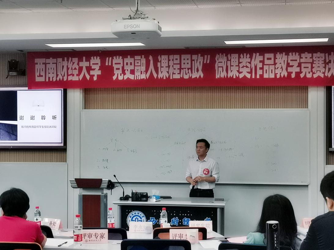 5月18日,西南財經大學“黨史融入課程思政”微課類作品教學競賽決賽成功舉辦。經過激烈角逐,我院教師何霞、游偉分別榮獲二等獎、三等獎。