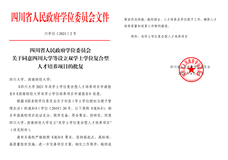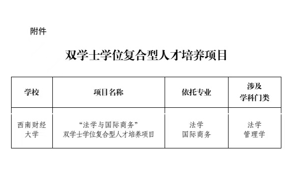 近日,西南財經大學法學院“法學與國際商務”雙學士學位復合型人才培養項目獲得四川省學位委員會批準,將于今年6月開始高考招生。這是繼2020年我院“法學與會計學”、“法學與金融學”雙學士學位項目后,獲批的第三個雙學士學位復合型人才培養項目。