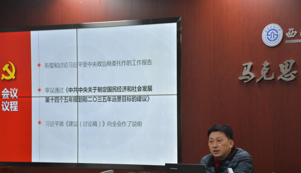 2020年12月15日,馬克思主義學院在通博樓A117召開政治理論學習會,四川省委宣講團成員、馬克思主義學院院長唐曉勇宣講黨的十九屆五中全會精神。會議由學院黨總支書記雷棟良主持,全體教職工參加會議。